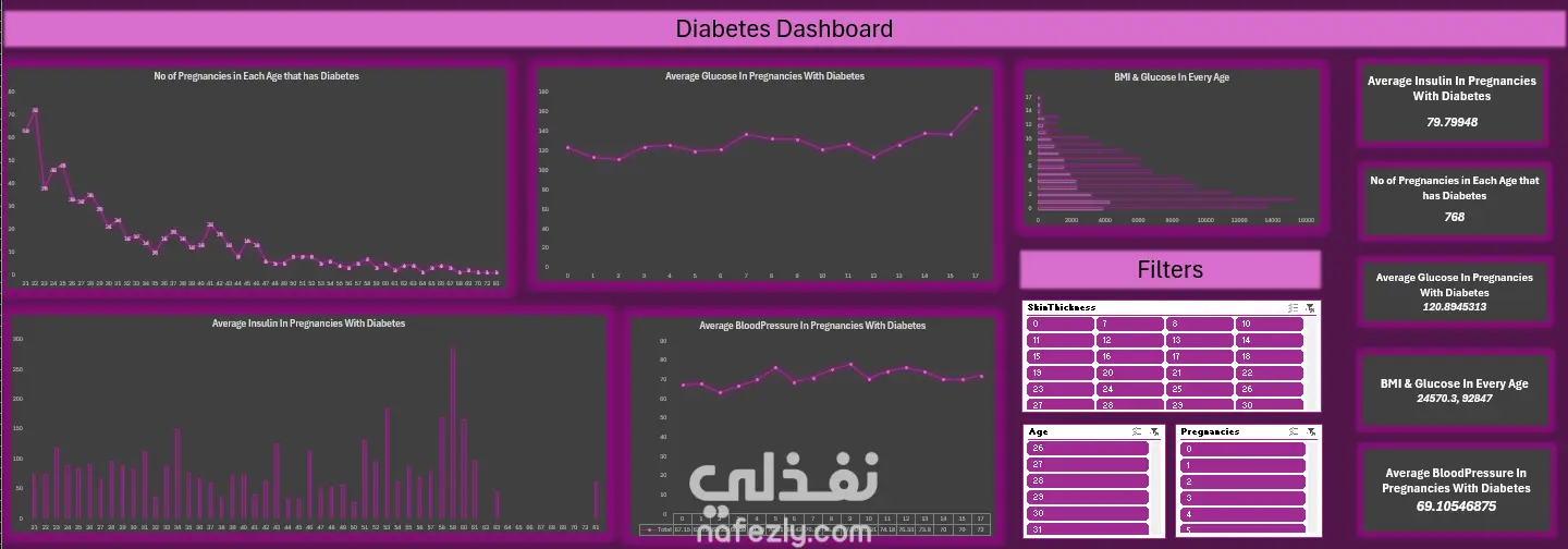 تعرض هذه اللوحة مجموعة من الرسوم البيانية والمؤشرات الرقمية التي توضح إحصائيات واتجاهات صحية متعلقة بمرض السكري، خاصة أثناء فترات الحمل. التصميم يتميز بألوان بنفسجية ووردية، ويُقسم إلى عدة أقسام منظمة بصريًا. الجزء العلوي: - عدد حالات الحمل حسب العمر لمرضى السكري: رسم بياني خطي يُظهر توزيع عدد حالات الحمل عبر الأعمار المختلفة. - متوسط الجلوكوز في حالات الحمل المصابة بالسكري: رسم بياني خطي يُوضح تغير مستويات الجلوكوز. - مخطط BMI والجلوكوز حسب العمر: رسم بياني عمودي يُقارن بين مؤشر كتلة الجسم ومستويات الجلوكوز عبر الأعمار، بجانبه مؤشرين رقميين: - متوسط الإنسولين في حالات الحمل المصابة بالسكري: 72.79849 - عدد حالات الحمل حسب العمر لمرضى السكري: 760 الجزء السفلي: - متوسط الإنسولين في حالات الحمل المصابة بالسكري: رسم بياني عمودي يُوضح مستويات الإنسولين. - متوسط ضغط الدم في حالات الحمل المصابة بالسكري: رسم بياني خطي يُظهر اتجاهات ضغط الدم. لوحة الفلاتر: تحتوي على مجموعة من القوائم المنسدلة لتصفية البيانات حسب: - الزيارة/السكري - العمر - عدد حالات الحمل - BMI والجلوكوز حسب العمر - متوسط الإنسولين - متوسط ض