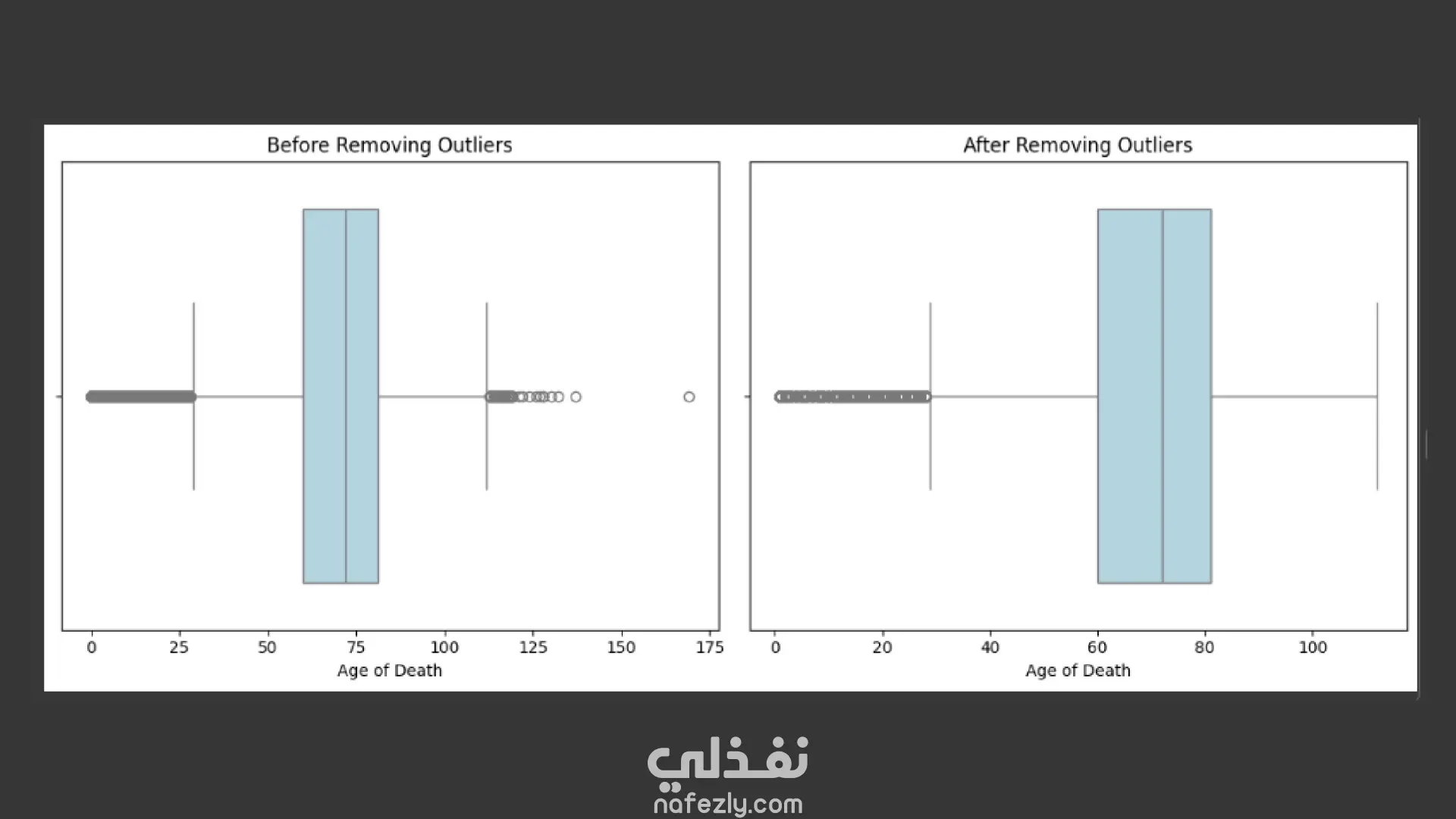 بعد ذلك، تعاملتُ مع القيم الشاذة (Outliers) في عمر الوفاة باستخدام المدى بين الربعين (IQR)، ثم أنشأتُ مجموعة من الرسوم البيانية التوضيحية باستخدام مكتبات Matplotlib وSeaborn لعرض النتائج مثل: