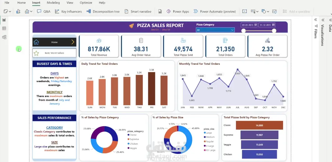 تم تقديم رؤى عملية لاتخاذ القرارات، مثل تحديد فترات ذروة المبيعات وفئات البيتزا الأفضل أداءً.