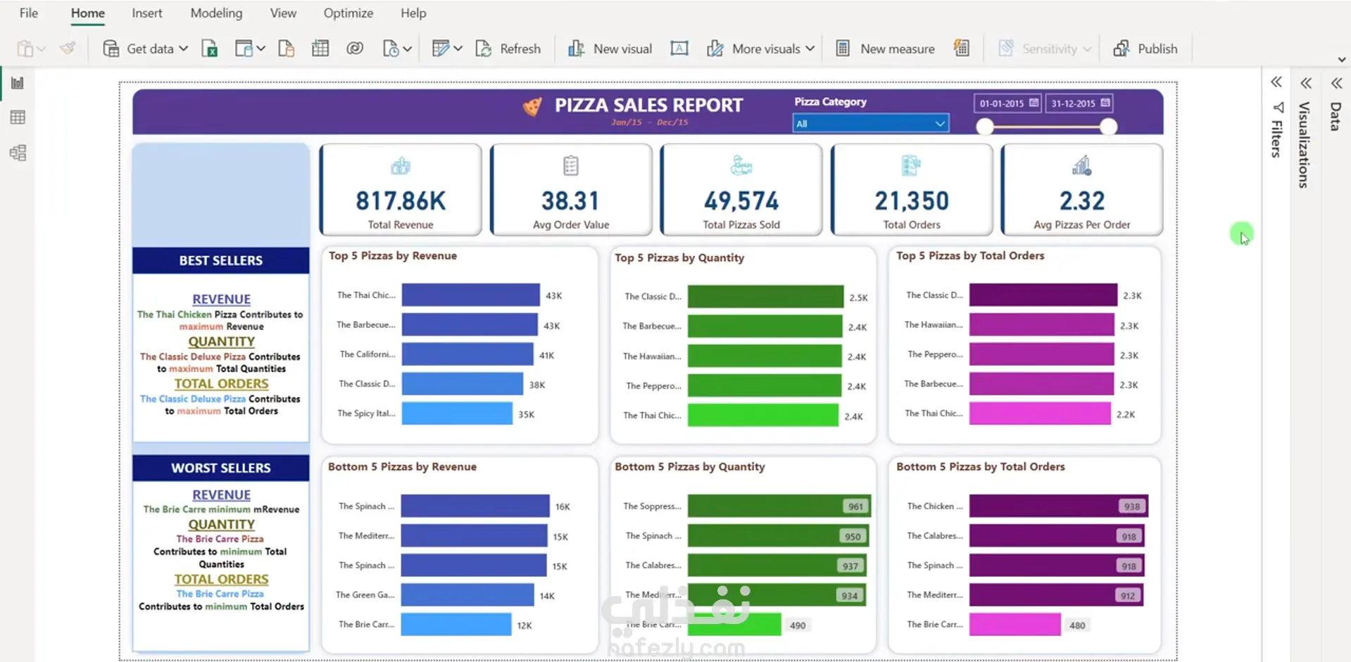 تم تطوير لوحة معلومات مبيعات تفاعلية باستخدام Power BI لتحليل أداء مبيعات البيتزا.