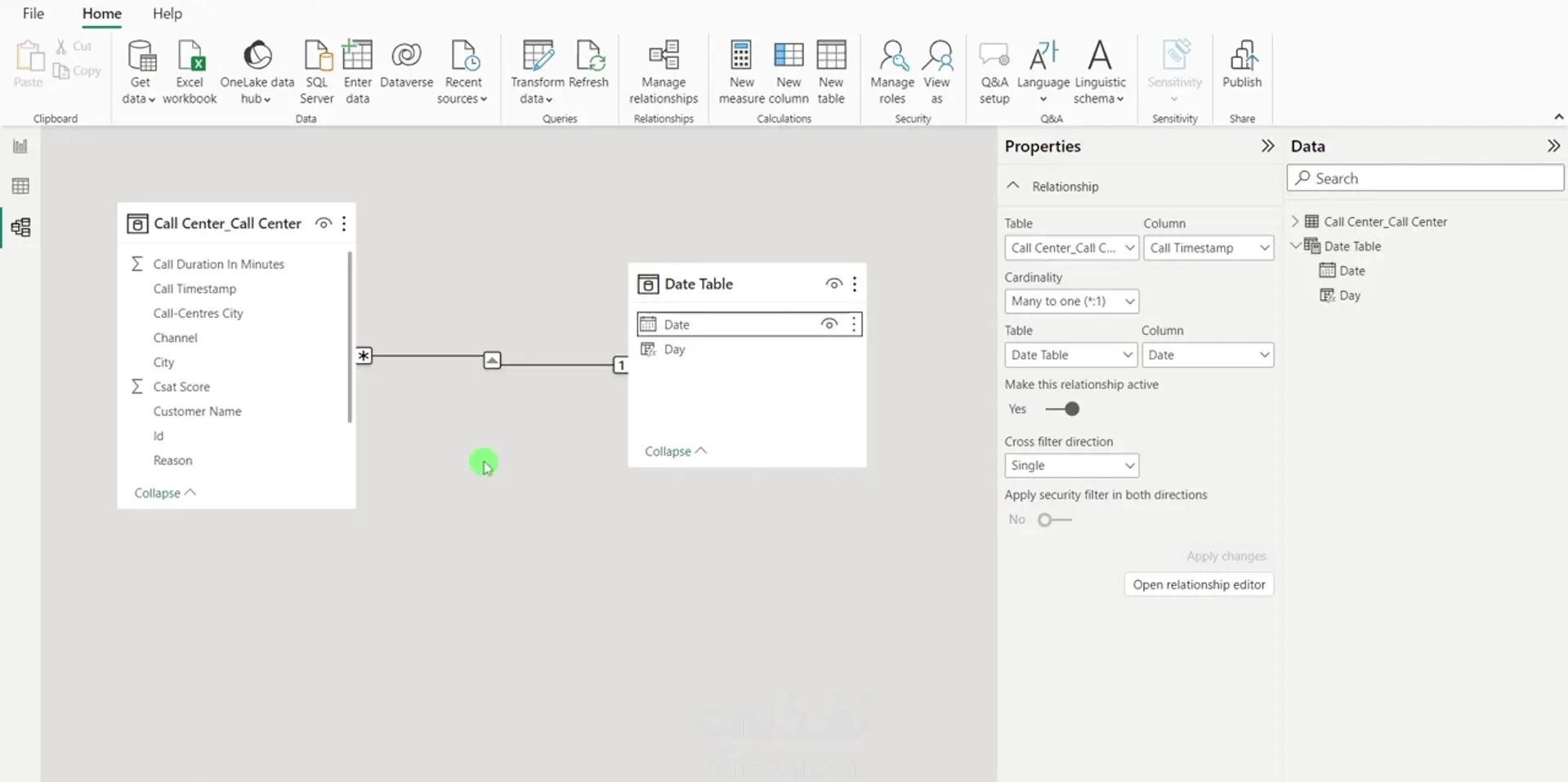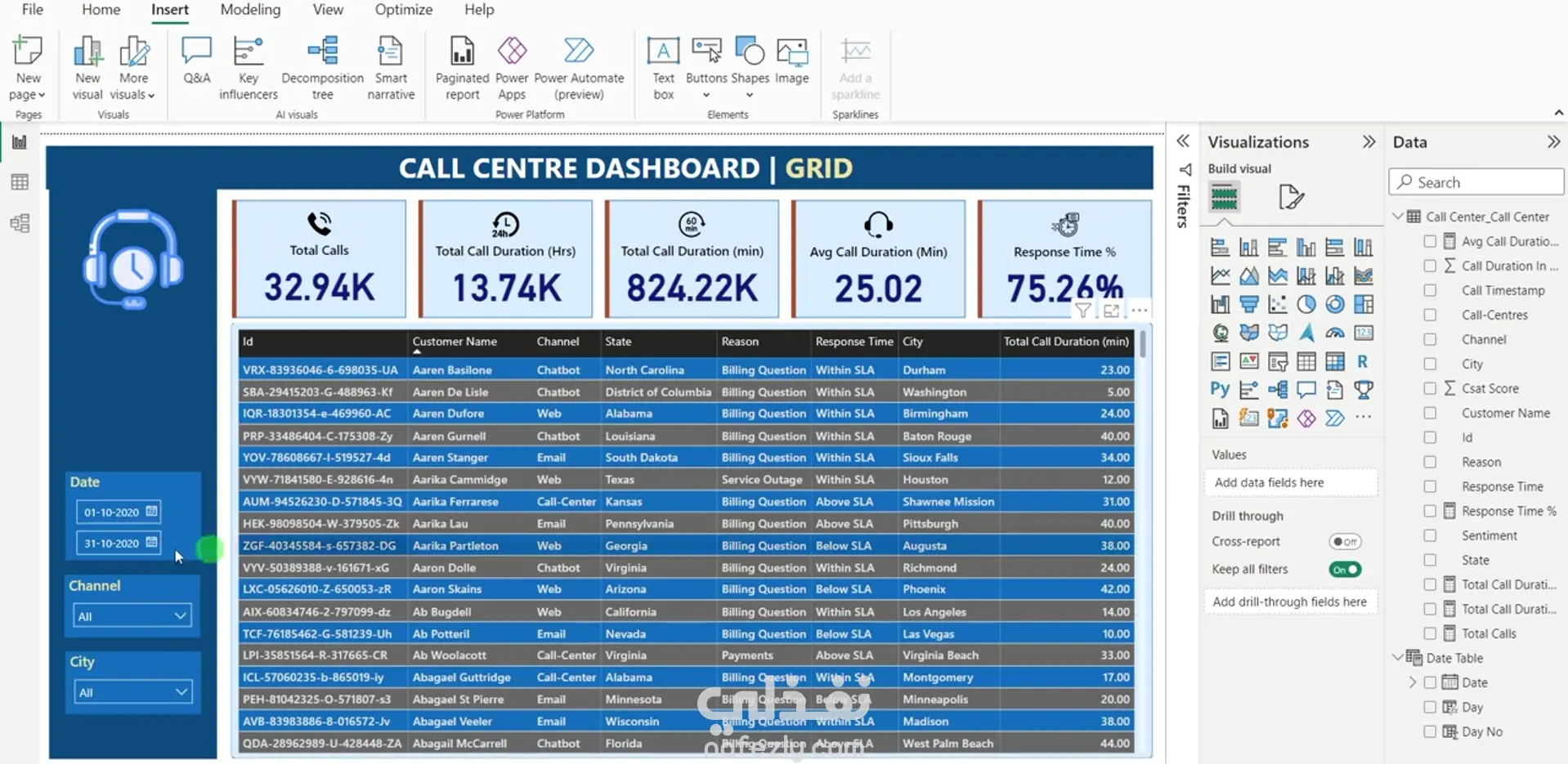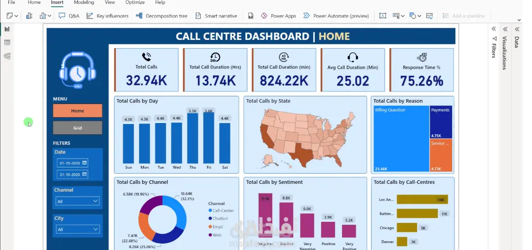 إجمالي المكالمات حسب القناة: مخطط دائري يُظهر قنوات الاتصال المختلفة (مثل: Call-Center، Chatbot، Email، Web)، مع كون "Call-Center" القناة الأكثر استخدامًا.