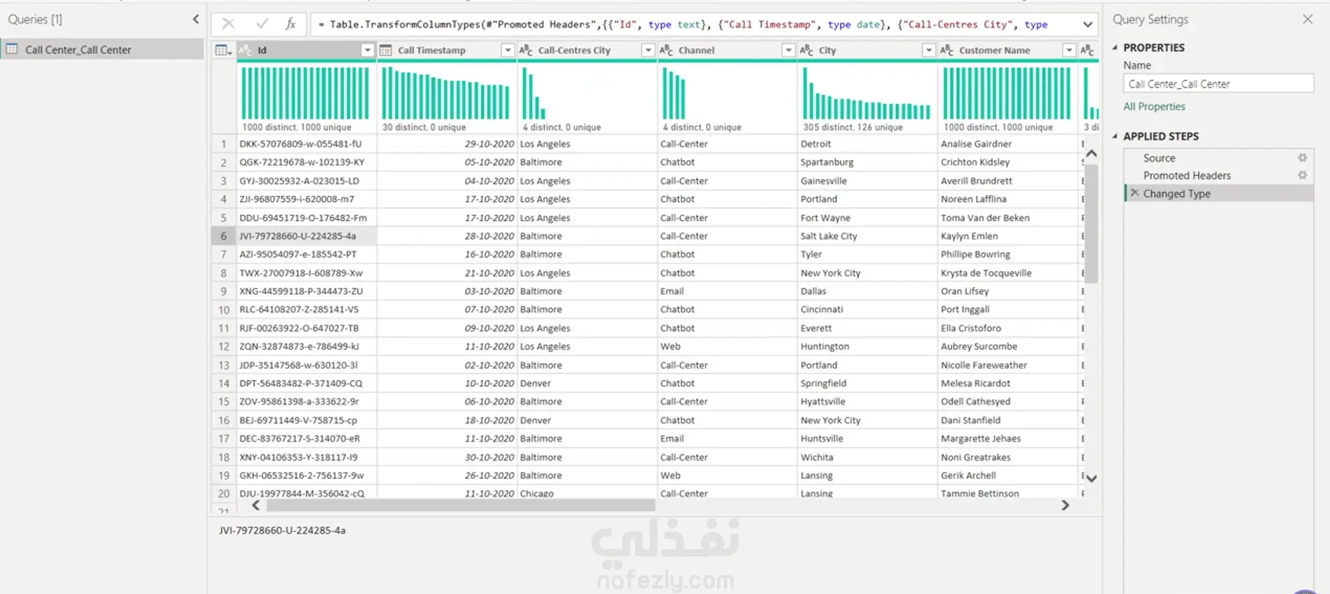إجمالي المكالمات حسب مراكز الاتصال: مخطط شريطي يوضح عدد المكالمات لكل مركز اتصال على حدة (مثل: Los Angeles، Baltimore، Chicago، Denver).