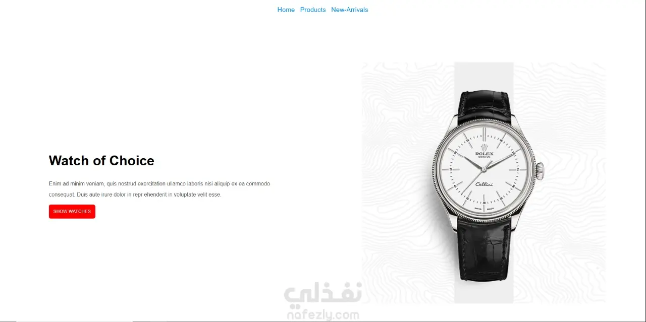 يظهر في بداية الصفحة مع ساعة مميزة وصورة جذابة، بجانبها عنوان ملفت مثل "Watch of Choice" ونص تعريفي قصير مع زر (CTA) باللون الأحمر لجذب الزائر للتصفح وشراء الساعات.