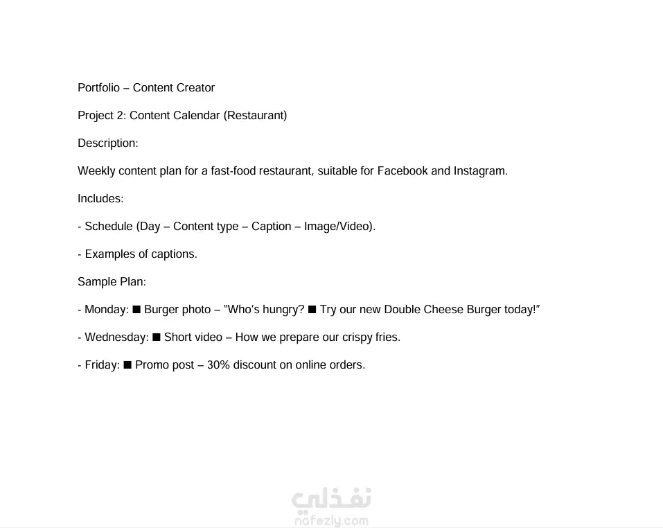 خطة محتوي اسبوعية لمطعم معين