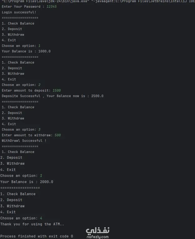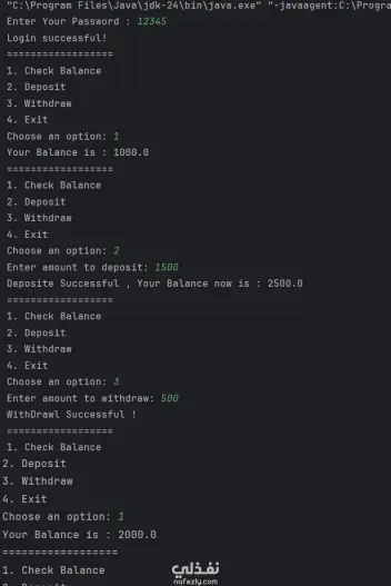 هو مشروع بسيط يحاكي عمل الصرّاف الآلي، حيث يقوم المستخدم أولًا بعملية تسجيل الدخول، ثم يختار من بين عدة خيارات متاحة: