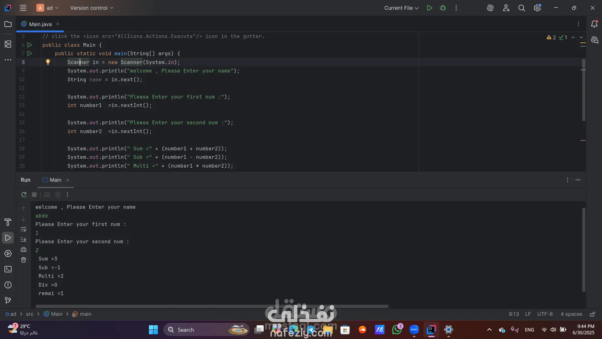 قمت ببرمجة تطبيق بسيط بلغة Java يقوم بعمليتين أساسيتين: التعامل مع النصوص: يطلب من المستخدم إدخال اسمه. يقوم بطباعته على الشاشة مع رسالة ترحيب. العمليات الحسابية: يطلب من المستخدم إدخال رقمين. ينفذ عليهم العمليات الحسابية الأساسية: الجمع (+) الطرح (-) الضرب (*) القسمة (/) يعرض النتائج بشكل منسق للمستخدم.