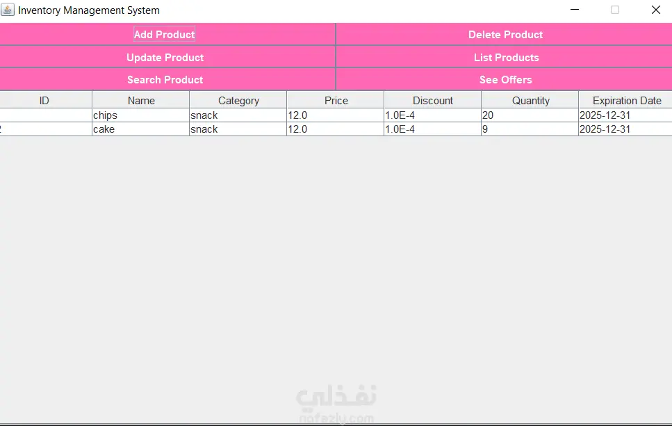 وصف عام: مشروع إدارة المخزون هو تطبيق مكتبي (Desktop Application) تم تطويره بلغة Java مع واجهة رسومية باستخدام Swing. يهدف إلى تسهيل عملية إدارة المنتجات داخل أي متجر أو مخزن عبر واجهة سهلة الاستخدام تتيح للمستخدم إضافة المنتجات، تعديلها، حذفها، والبحث عنها بسرعة. أهداف المشروع: إدارة بيانات المنتجات (الاسم – الكمية – السعر – التصنيف). تتبع كميات المنتجات وتحديثها بشكل ديناميكي. تسهيل عمليات البحث والتصفية داخل المخزون. عرض واجهة تفاعلية منظمة وسهلة الاستخدام. تحسين دقة إدارة المخزون وتقليل الأخطاء اليدوية. الوظائف الرئيسية (Features): إضافة منتج جديد: إدخال اسم المنتج، السعر، الكمية، والفئة. تعديل بيانات منتج موجود: تحديث السعر أو الكمية بسهولة. حذف منتج: إزالة منتج غير متوفر من القائمة. عرض قائمة المنتجات: جدول يحتوي جميع بيانات المنتجات المخزنة. بحث سريع: البحث عن منتج بالاسم أو الفئة. واجهة تفاعلية: مبنية باستخدام مكونات Swing مثل JFrame, JTable, JTextField, و JButton.