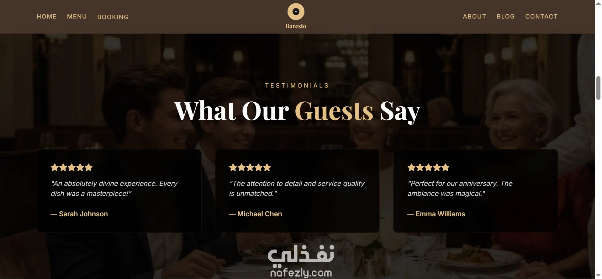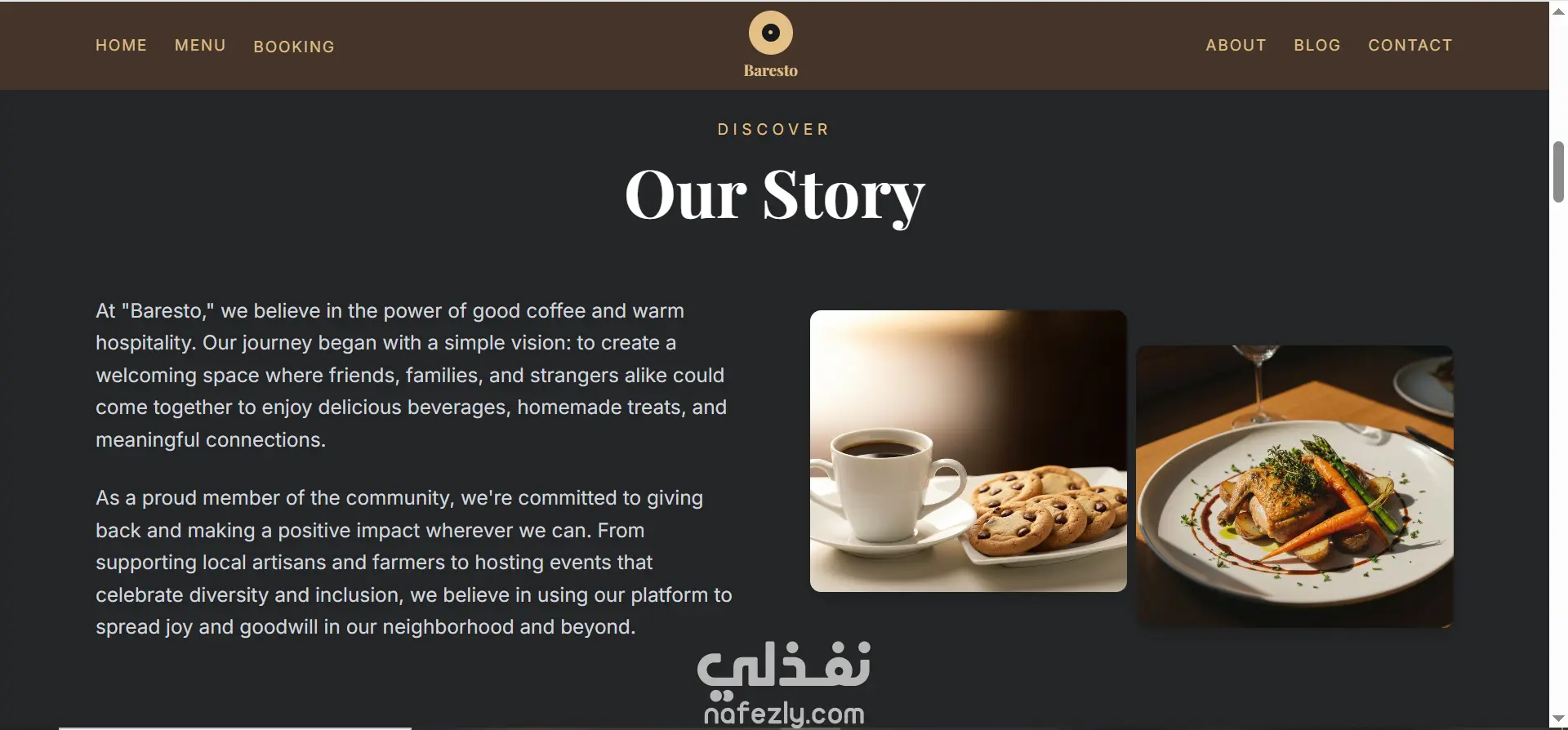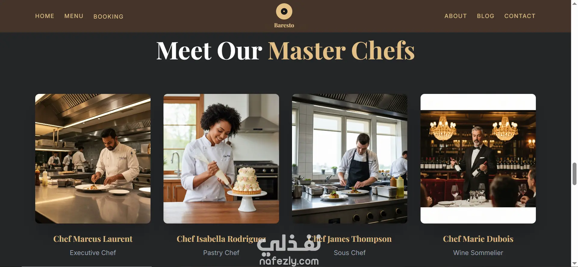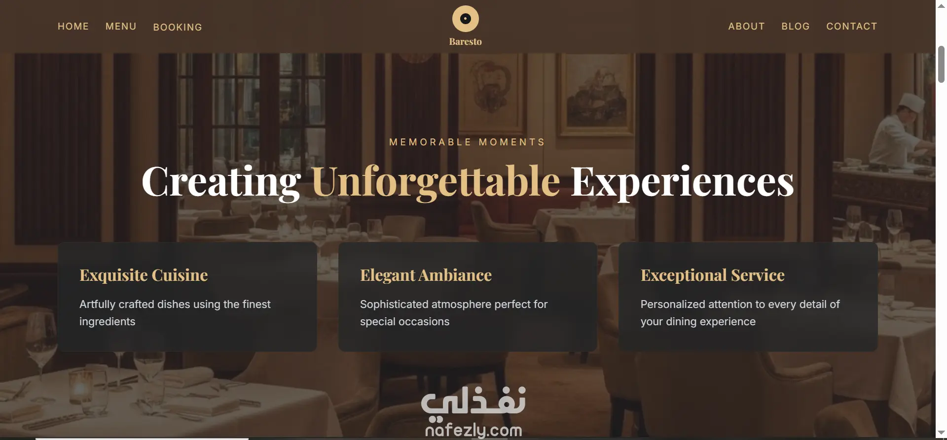 صمّمت وطبَّقت موقعًا أنيقًا لمطعم فاخر يحمل اسم Baresto، يركّز على إبراز تجربة الضيافة الفاخرة والمأكولات الراقية بأسلوب بصري دعائي مميّز. الموقع يحتوي على: صفحة رئيسية (Home) تعرض الشعار، دعوة لتصفح القائمة (View Menu) وحجز (Booking). قسم “Our Story / About” يحكي قصة المطعم والرؤية والقيم. قسم “Menu / Our Menu” يضم أطباقًا مميزة مع أسعار (Espresso Romano، Signature Blend، Wagyu Beef، Lobster Thermidor، غيرها). قسم “Our Team” لعرض طاقم الطهاة مع صور وأدوارهم. آراء الزبائن (Testimonials) لتعزيز المصداقية والتجربة الإنسانية. “Visit Us” – معلومات الموقع، ساعات العمل، الاتصال. تصميم استجابة كامل (responsive) ليتناسب مع الشاشات المختلفة. تركيز على التجربة البصرية: صور فاخرة، المساحات البيضاء، تباين أنيق بين النصوص والخلفيات.