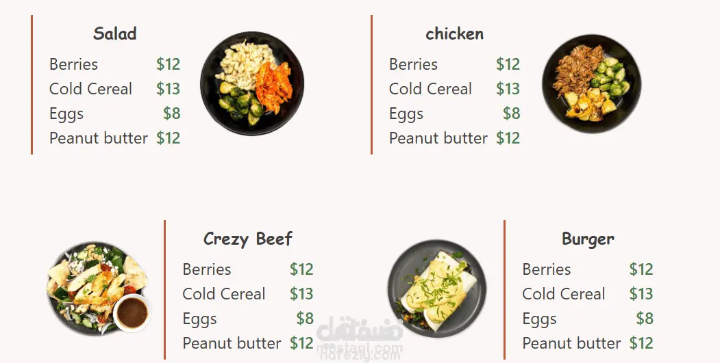 قمت بتصميم وبرمجة موقع مطعم متكامل يعرض قائمة الطعام مع صور جذابة وأقسام مرتبة (إفطار – سلطات – برغر – حلويات – عصائر). الموقع يحتوي على: صفحة رئيسية بتصميم عصري وجذاب. قسم "من نحن" لتعريف المطعم. قائمة طعام ديناميكية وسهلة التصفح. إمكانية الحجز أو الطلب مباشرة عبر الموقع. معلومات التواصل (العنوان – الهاتف – البريد). تصميم متجاوب مع جميع الأجهزة وسرعة تحميل عالية.