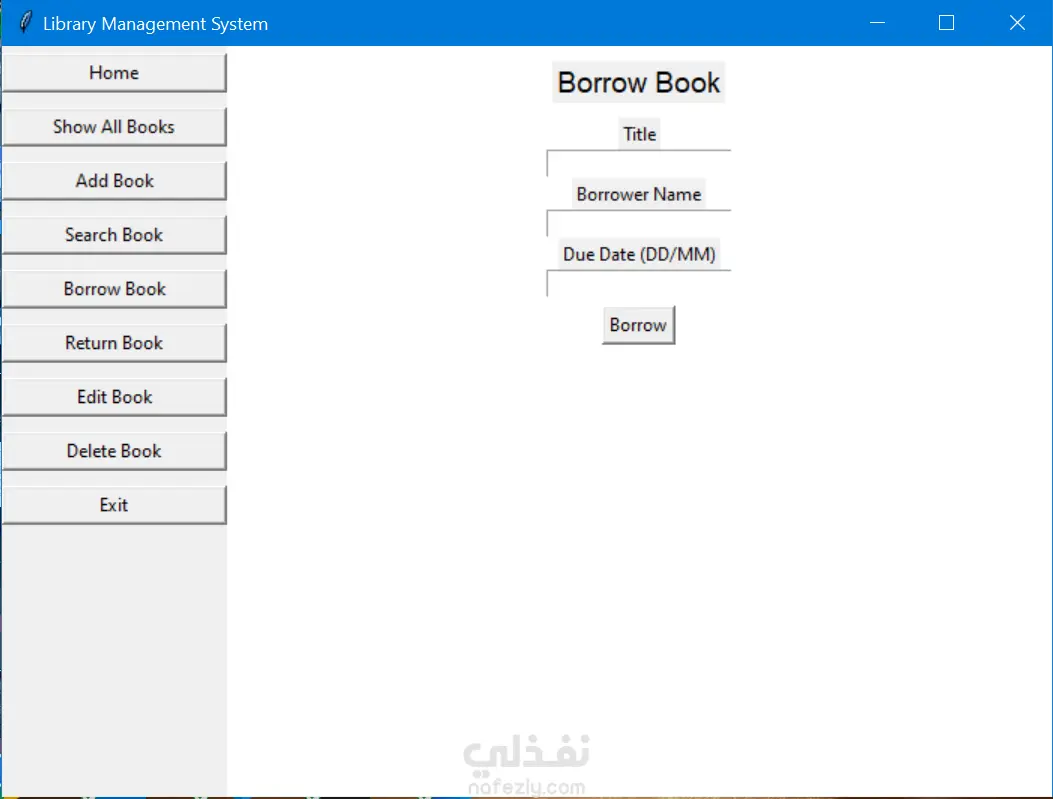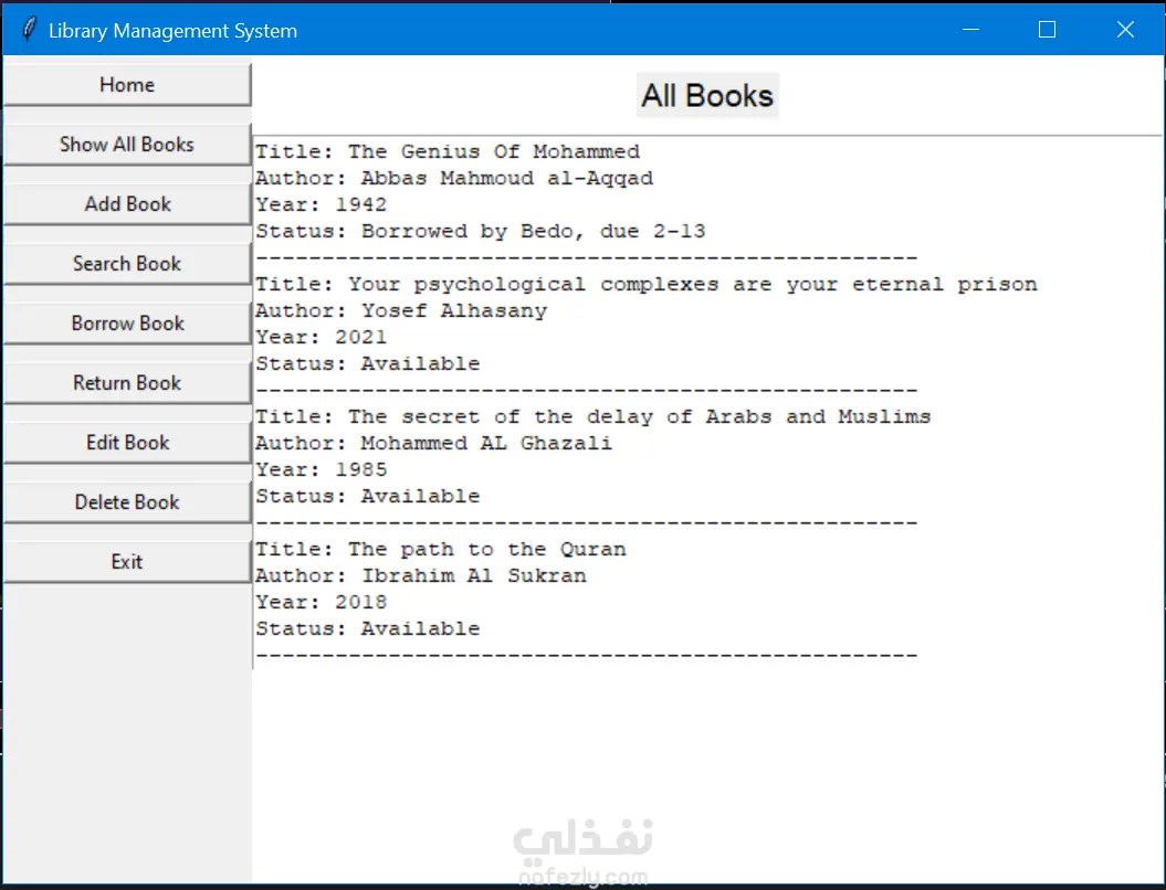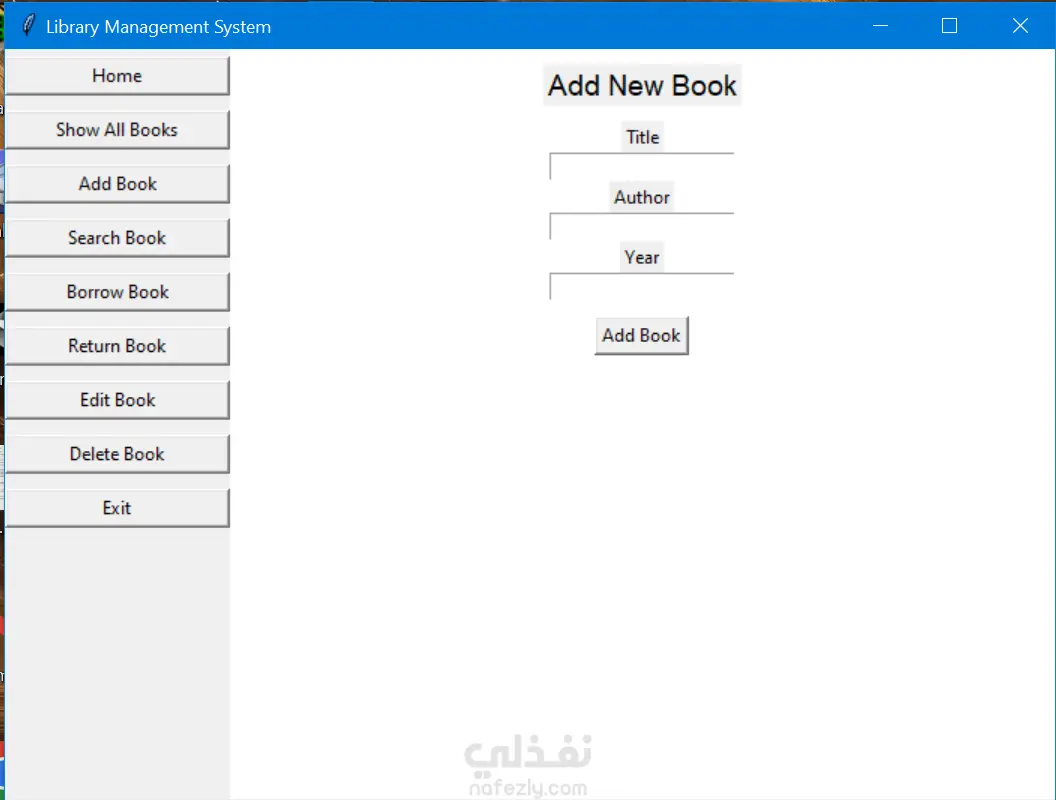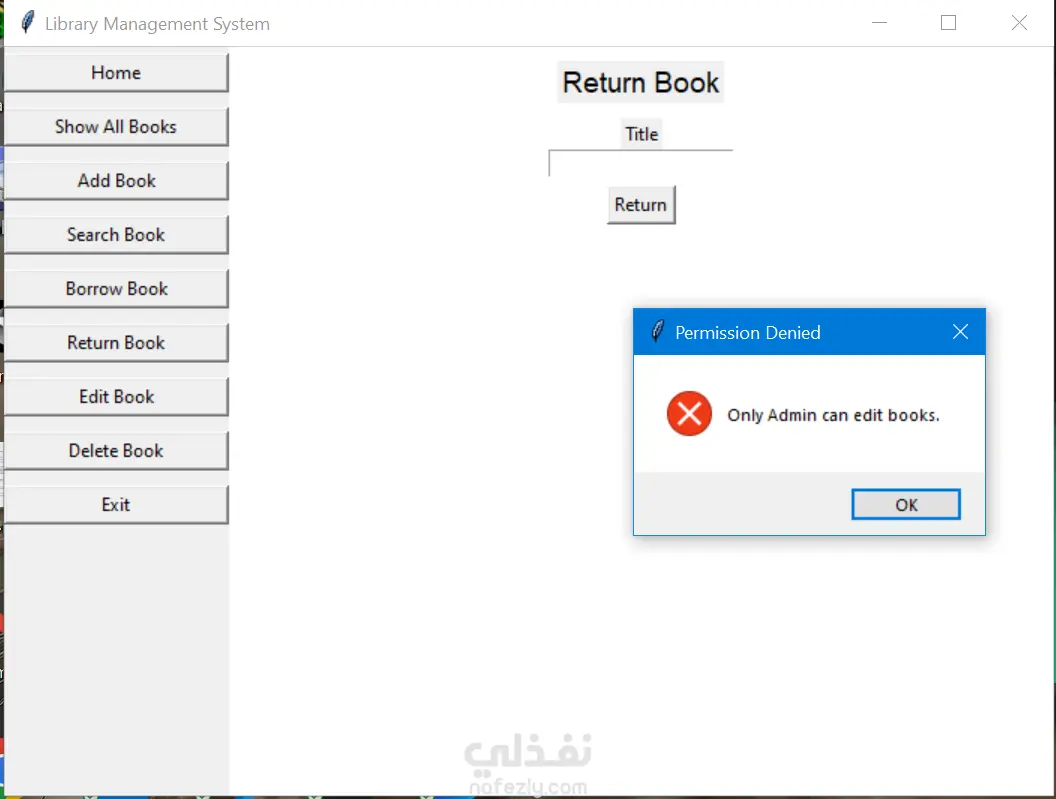 نظام إدارة مكتبة بسيط مُطوَّر بلغة Python مع واجهة رسومية باستخدام Tkinter. يَسمح للمشرف والمستخدم العادي بالتعامل مع النظام وفقًا لصلاحيات كل دور. الميزات إضافة، تعديل، وحذف الكتب (خاص بالمشرف). البحث عن الكتب بالعنوان أو باسم المؤلف. استعارة وإرجاع الكتب. نظام تسجيل دخول مع صلاحيات حسب الدور (مشرف / مستخدم). حفظ البيانات في ملفات JSON. واجهة رسومية بسيطة مطوّرة باستخدام Tkinter. بيانات دخول المشرف (تجريبية) اسم المستخدم: admin كلمة المرور: 181222 ملاحظة: هذه بيانات عرض/اختبار فقط — لا يُنصح باستخدامها في بيئات الإنتاج. التقنيات المستخدمة Python 3 Tkinter (للواجهة الرسومية) JSON (لتخزين البيانات) كيفية التشغيل تأكد من تثبيت Python على جهازك. استنسخ المستودع: https://github.com/bedo3016/Library_Management_System.git افتح مجلد المشروع وشغّل الملف الرئيسي باستخدام Python (مثلاً: python main.py أو اسم الملف الرئيسي الموجود في المستودع).
