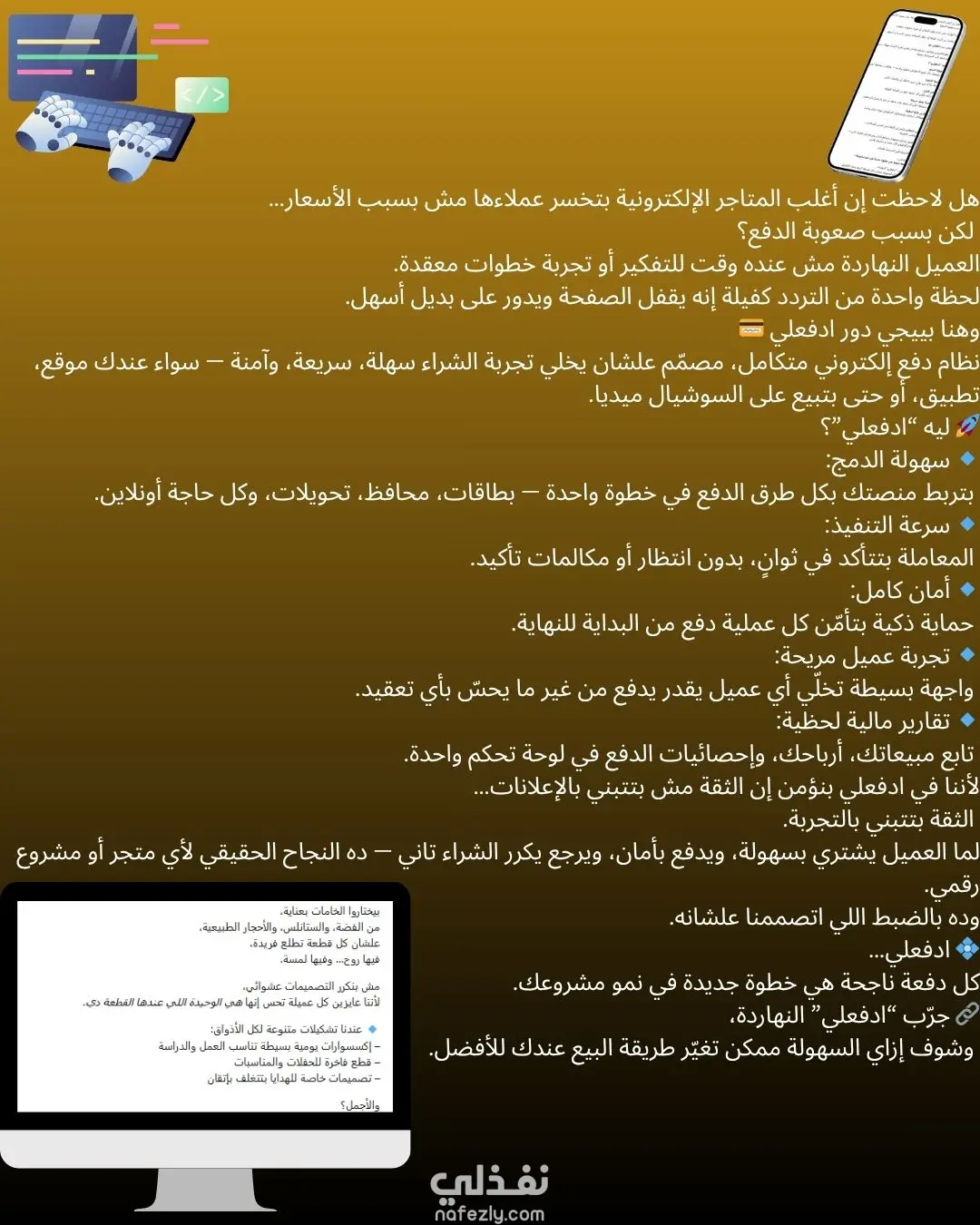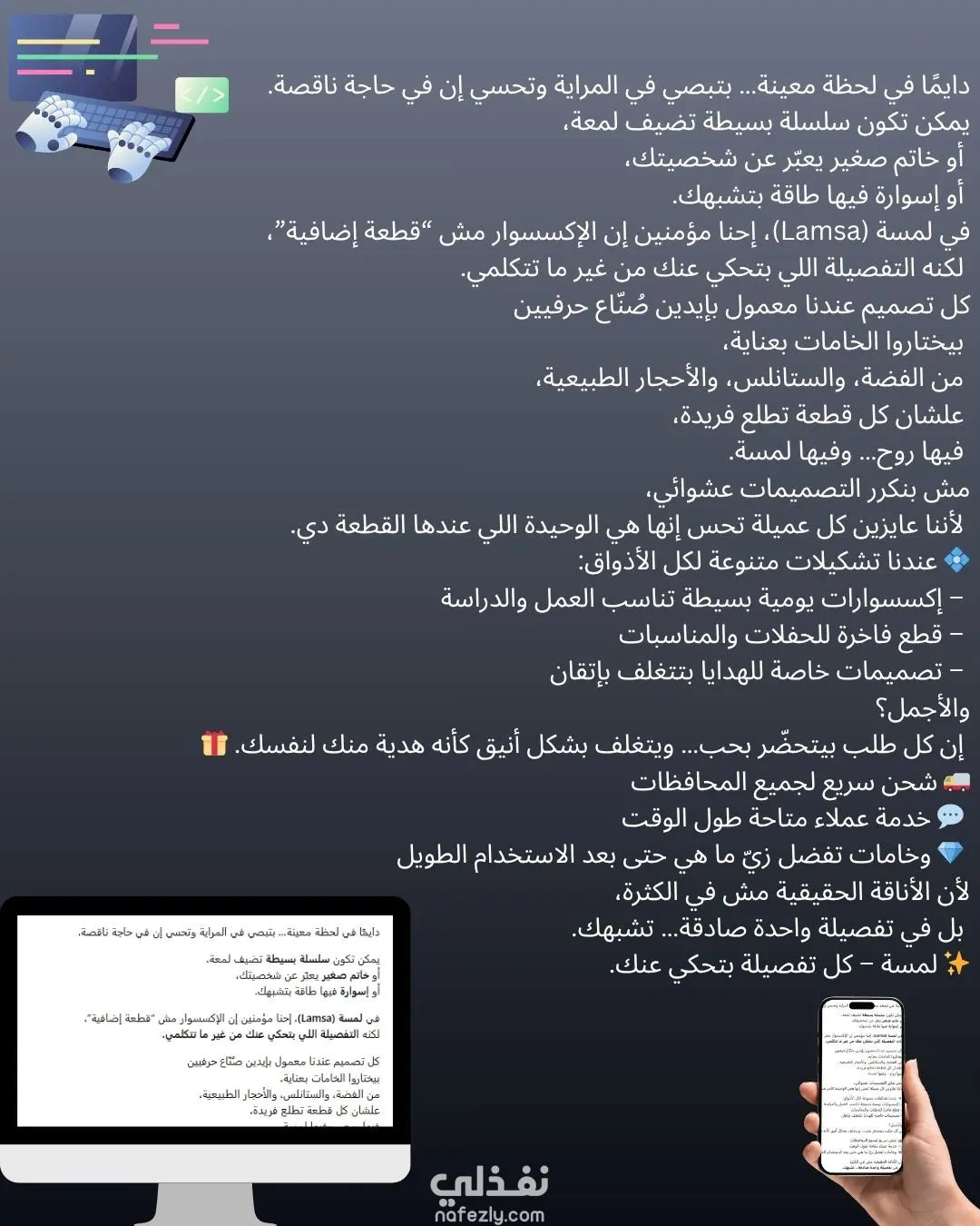 وصف الخدمة هل تعبت من كتابة منشورات كثيرة بدون جدوى؟ تفاعل ضعيف… رسائل قليلة… ولا مبيعات واضحة؟ السر مش في عدد البوستات ولا في إعلانات مكلفة، السر في الكلمات. الكلمات الصح تبني جسر يربطك بعميلك مباشرةً، وتحوّل الفضولي لمهتم، والمهتم لمشتري. أنا أكتب لك هذا الجسر: محتوى استراتيجي للسوشيال ميديا والمواقع نصوص إعلانية مقنعة سكربتات فيديو وموشن تجذب وتجبر العميل يكمل للنهاية كل كلمة تنكتب بالعربية أو الإنجليزية بهدف واحد: رفع التفاعل ➝ جذب العملاء ➝ تحويل الرسائل لطلبات حقيقية. خلّي محتواك يشتغل لصالحك، مش مجرد كلام على الفاضي. الخدمة الأساسية تشمل اعلان او بوست واحد بحد اقصى 1000 كلمة لماذا هذه الخدمة؟ التركيز على النتائج: نصوص مباشرة تقود العميل لاتخاذ الإجراء المطلوب، بعيدًا عن الحشو. بناء الثقة بالعلامة: عرض حلولك بطريقة واضحة ودقيقة تضعك كخيار موثوق. استهداف ذكي: جذب العملاء الجادّين فقط واستبعاد من يضيّعون وقتك. إتقان ثنائي اللغة: محتوى عربي/إنجليزي متوافق مع سياسات كل منصة. ماذا أقدّم لك في هذه الخدمة الشاملة؟ محتوى استراتيجي للويب والسوشيال: صفحات مواقع، لينكدإن، فيسبوك، إنستغرام… بصوت يعكس هوية علامتك ويقربك من عميلك. نصوص إعلانية وبيانات صحفية: عناوين لافتة، عرض مزايا مقنع، ورسائل ختامية (CTA) تدفع القارئ لاتخاذ القرار. سكريبتات فيديو/موشن وتعليق صوتي: صياغة احترافية لإعلانات قصيرة، ريلز، يوتيوب، أو حتى كورسات مصغّرة. كل قطعة محتوى تُكتب لتكون أداة جذب وتحويل، مش مجرد نص جميل. ما الذي ستستلمه محتوى صافي خالٍ من الحشو. مُحسَّن للقراءة السريعة. صياغة عناوين/هوك Hooks، زوايا إقناع، وCTA واضحة. صياغة عناوين ملفته حقوق استخدام تجارية كاملة للنصوص المسلَّمة. لك الحق الكامل علي النصوص المسلَّمة. إمكانية الكتابة بالعربية أو الإنجليزية أو مزيج حسب الطلب
