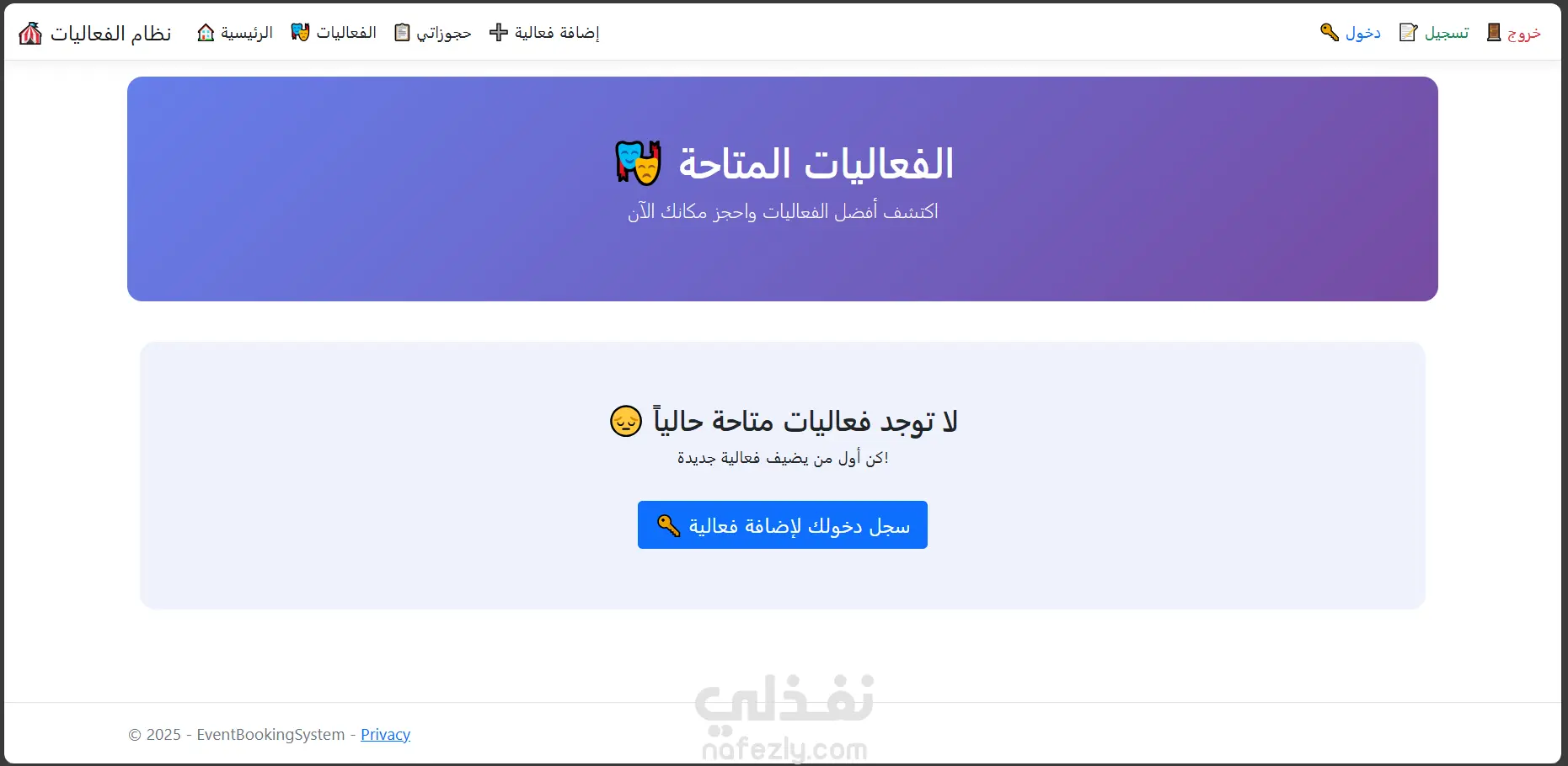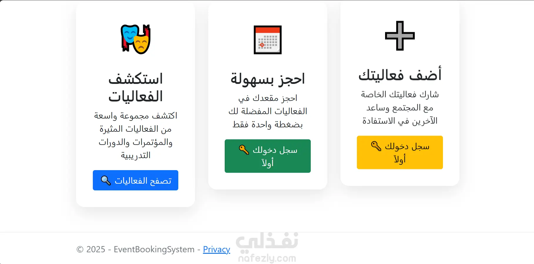 نظام حجز وإدارة الفعاليات متكامل مبني بتقنية ASP.NET Core MVC مع Entity Framework يتضمن لوحة تحكم سهلة الاستخدام مع نظام تسجيل دخول آمن (Session-based Authentication) وقاعدة بيانات SQL Server جاهزة للعمل. أقدم لك خدمة تطوير نظام حجز الفعاليات متكامل باستخدام أحدث التقنيات: ASP.NET Core MVC - إطار العمل الأقوى من Microsoft Entity Framework Code First - للتعامل الاحترافي مع قواعد البيانات SQL Server - قاعدة بيانات موثوقة وآمنة Bootstrap 5 - تصميم عصري ومتجاوب تصميم Responsive - يعمل على الموبايل، التابلت، والكمبيوتر واجهات مستخدم عصرية بألوان متدرجة جذابة سهل التعديل والتطوير مستقبلاً متوافق مع معايير SEO الأساسية