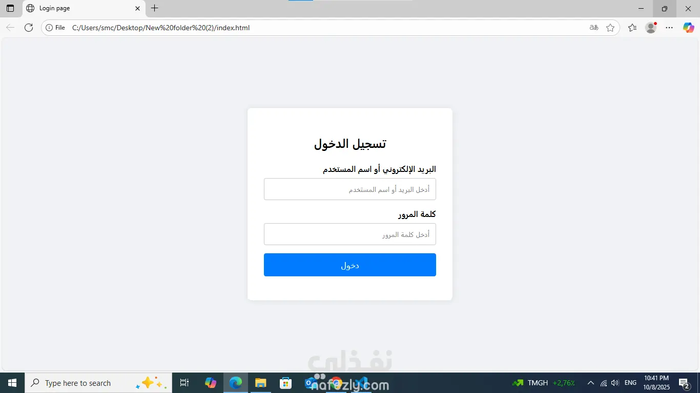 إنشاء صفحة تسجيل دخول احترافية وبسيطة باستخدام HTML وCSS وJavaScript فقط، لتكون واجهة أولية لأي تطبيق ويب يتيح للمستخدمين تسجيل الدخول عبر البريد الإلكتروني أو اسم المستخدم وكلمة المرو