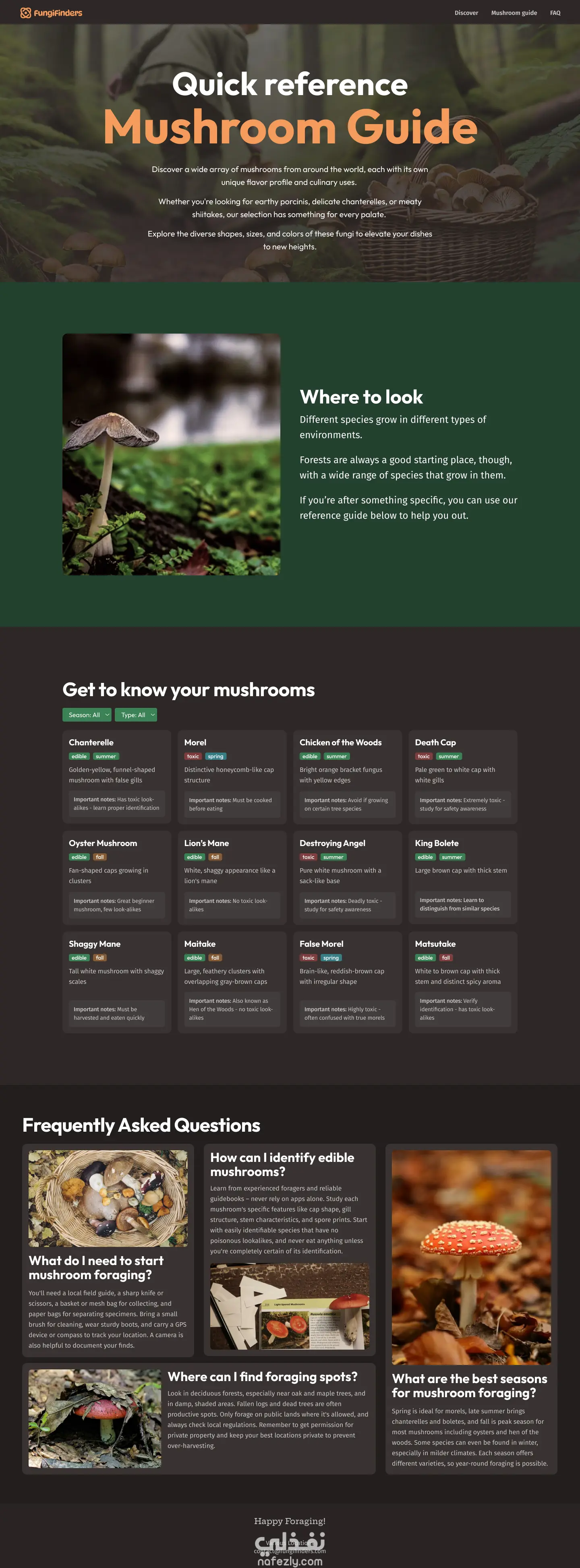 صممت وطورت صفحة متكاملة تقدم معلومات علمية بطريقة مرئية، سهلة، ومنظمة. المميزات: تصميم بسيط ومرتب يعتمد على الألوان والرموز لتوضيح التصنيفات (أكلية / سامة / موسم). نظام فلترة ذكي حسب الفصل والنوع لتسهيل البحث. كروت منظمة لكل نوع فطر — مع صور، وصف، وملاحظات مهمة. قسم أسئلة شائعة (FAQ) مع صور ونصوص مدعومة بصور توضيحية. تصميم متجاوب 100% — يعمل على الجوال والكمبيوتر. كود نظيف وسهل التعديل لاحقًا. الموقع مبني باستخدام: HTML5, CSS3, JavaScript — مع دعم كامل لـ Bootstrap أو أي إطار عمل حسب طلب العميل. مثالي لمشاريع التعليم، الدليل العلمي، أو أي موقع يحتاج عرض معلومات بطريقة مرئية وجذابة!