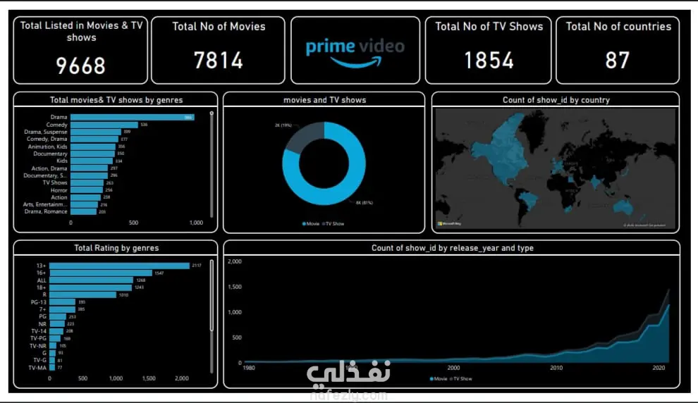 is an interactive dashboard built with Power BI, analyzing over 9,600 movies and TV shows available on Amazon Prime Video across 87 countries. It provides visual insights into genres, ratings, content types, and release trends using dynamic charts, maps, and KPIs. The dashboard was designed to support data-driven decisions and showcase content distribution patterns in an intuitive, user-friendly format