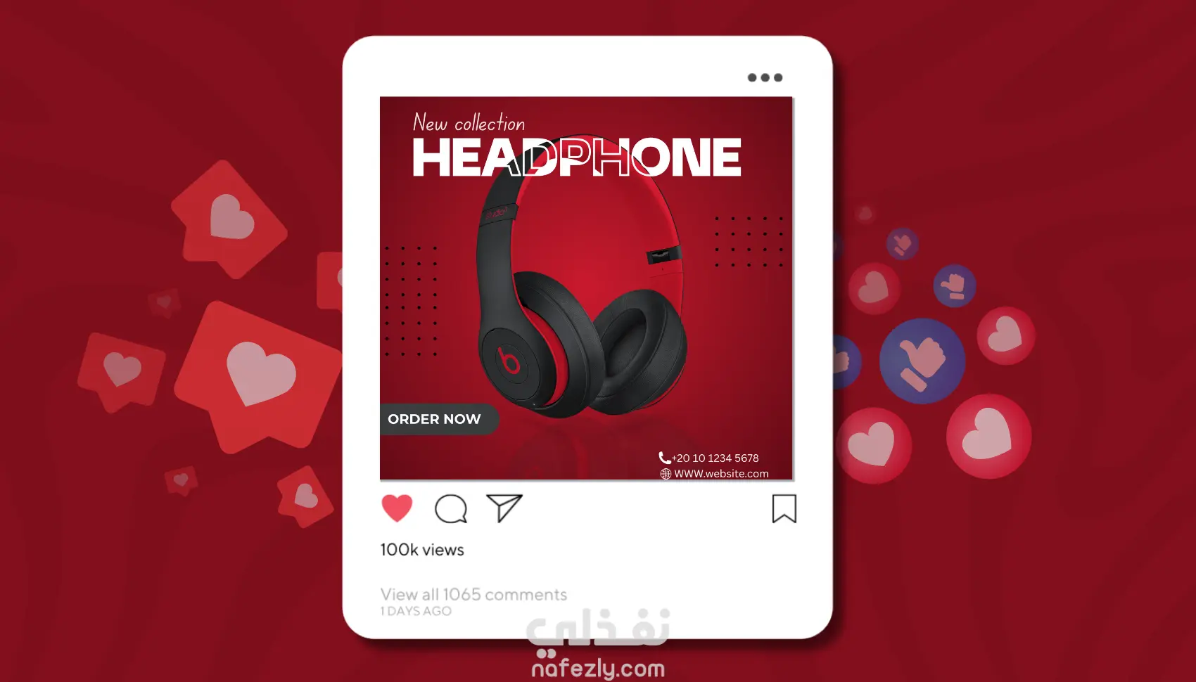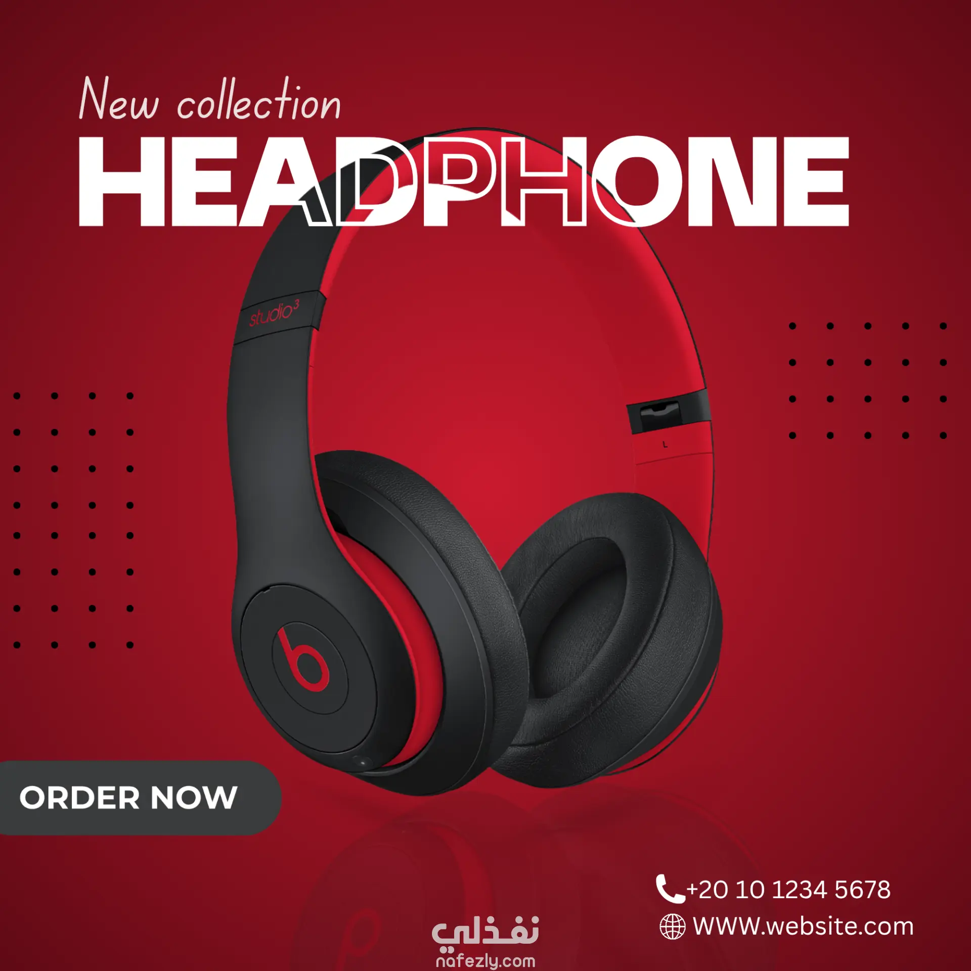 في التصميم ده ركزت على إبراز السماعة كعنصر أساسي بطريقة عصرية ولافية باستخدام خلفية باللون الاحمر الغامق عشان توصل إحساس بالطاقة والقوة دمجت بين الاسود والاحمر لأنهم الوان بتعبر عن الفخامة والجرأة في نفس الوقت وبتدي إحساس بالحماس للموسيقى خليت النص يكون بخط كبير وجذاب يلفت الإنتباه مع لمسة خفيفة من اللون الابيض لخلق توازن بصري زر "Order Now" بالرمادي الغامق أضاف لمسة احترافية وشجع على اتخاذ القرار فورًا وكمان اضفت معلومات التواصل بشكل منظم وواضح في الاسفل