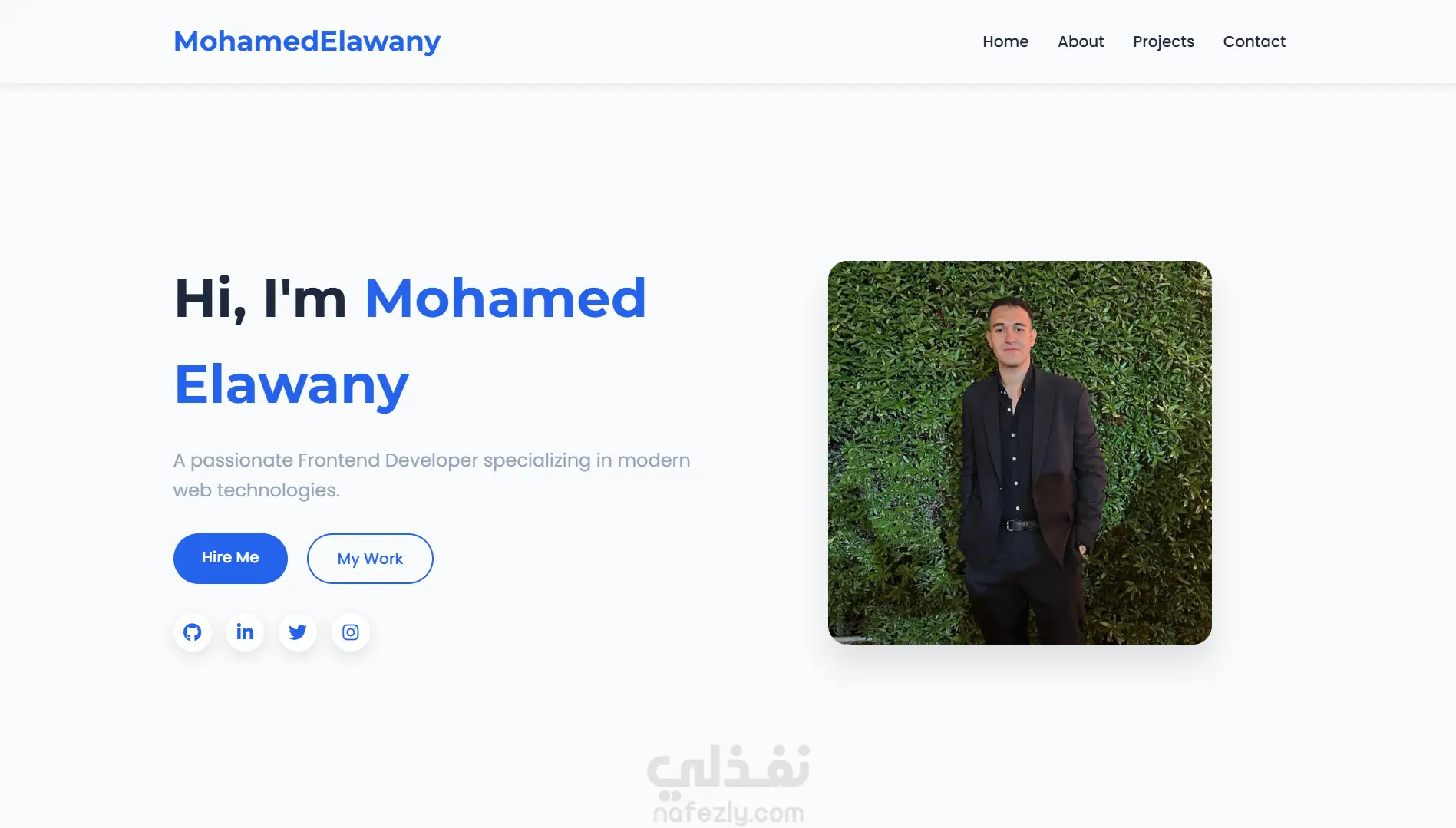 موقع "MohamedElawany" هو موقع شخصي احترافي تم تصميمه كبوابة عرض لمهاراتي كمطوّر واجهات أمامية (Frontend Developer) متخصص في التقنيات الحديثة للويب.