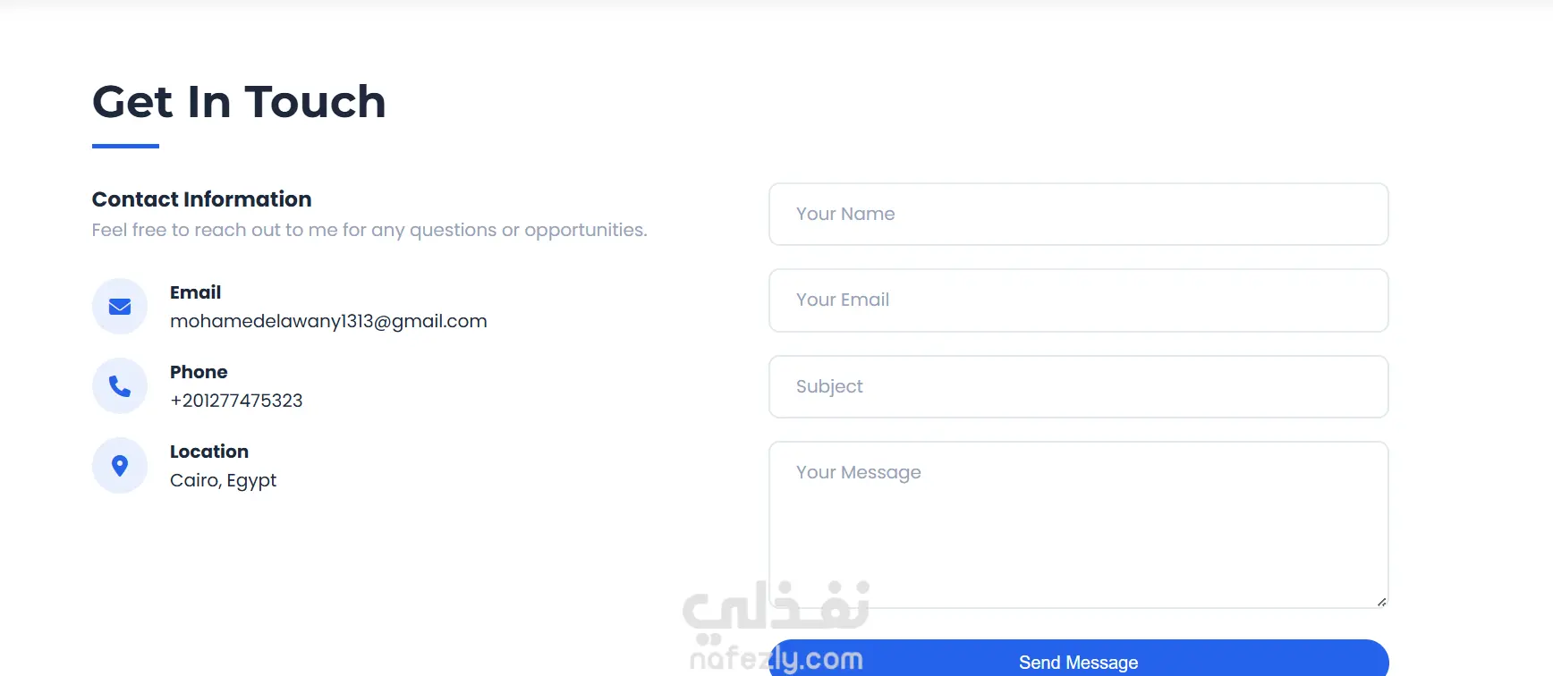 صفحة اتصال (Contact) مع خيارات للتواصل عبر البريد الإلكتروني أو منصات التواصل الاجتماعي.
