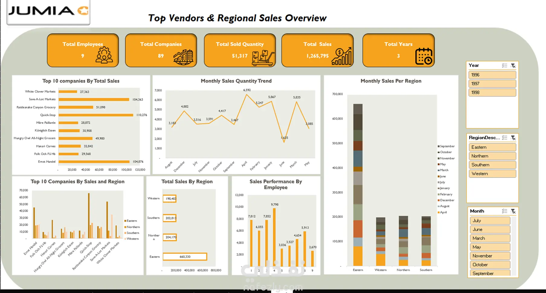 صممتُ داش بورد تفاعلي لمبيعات الأقاليم والمورّدين باستخدام Excel، Power Query وPower Pivot.