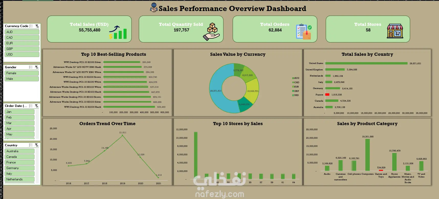 توزيع المبيعات حسب المناطق والفترات الزمنية مع فلاتر تفاعلية.