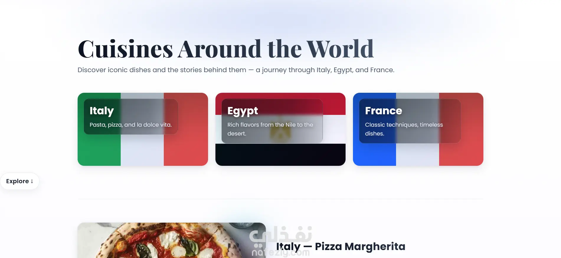هذا موقع تعريفي أنيق يستعرض مطابخ العالم عبر تجربة سردية مختصرة تجمع بين البساطة والبصرية القوية، حيث يرحّب بعنوان لافت ثم يقدّم بطاقات تفاعلية لكل بلد مع لمحة عن نكهاته المميزة وأشهر أطباقه بطريقة تشجّع على الاستكشاف نزولًا في الصفحة.