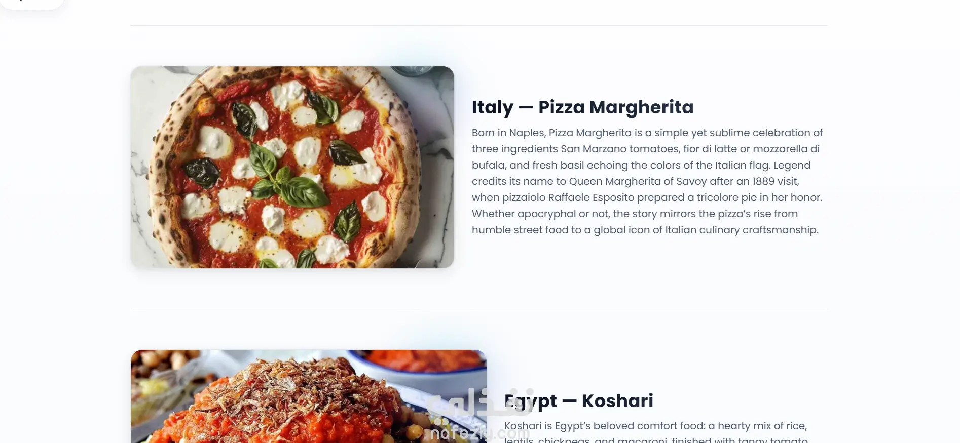 مناسب كصفحة هبوط تعليمية لمشروع طهو أو مدونة سفر غذائي أو معرض لدروس طبخ، إذ يجمع بين سرد ثقافي مختصر وروابط مرئية جذابة تسهّل التفاعل والتوسّع لاحقًا بقوائم أطباق ومراجع إضافية