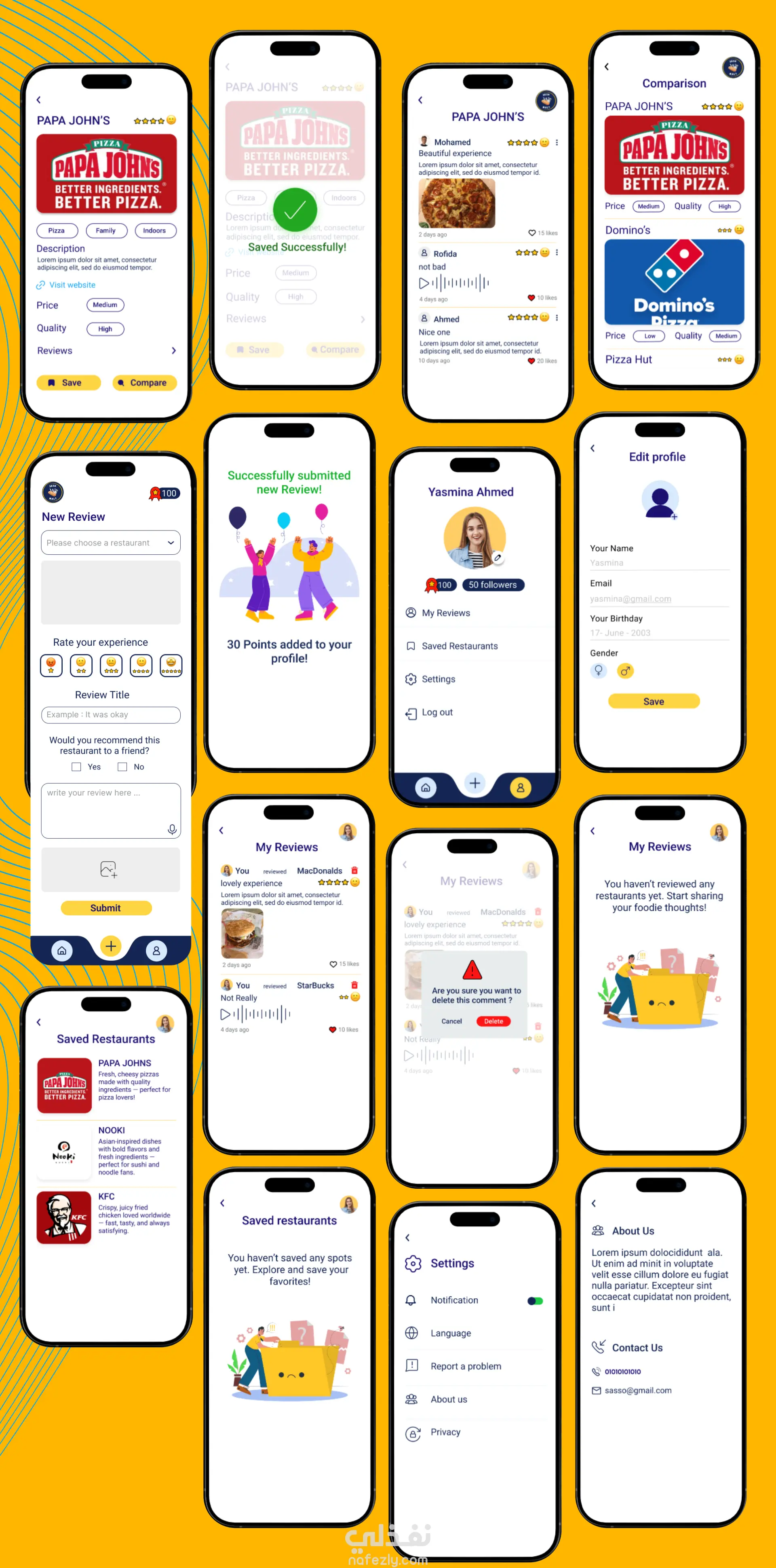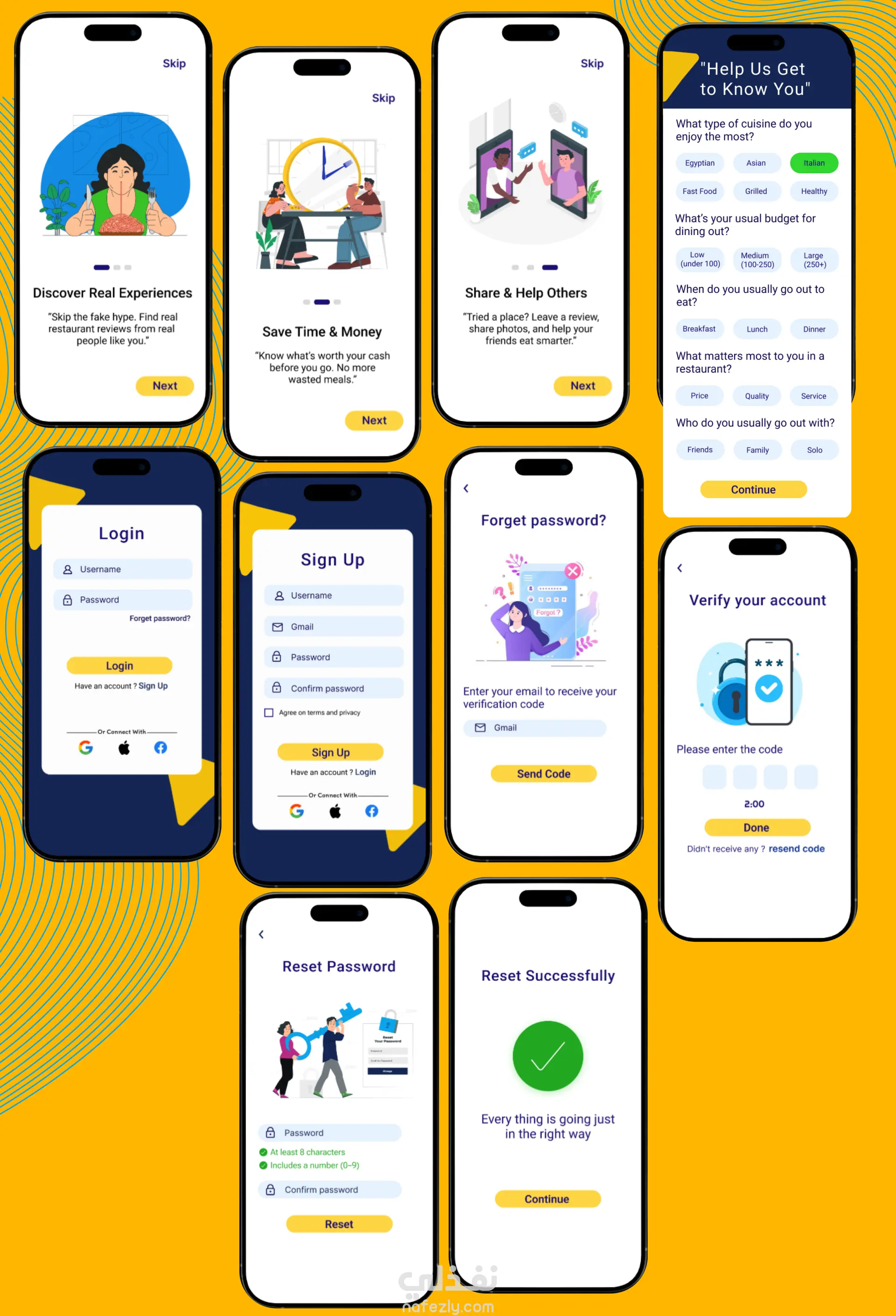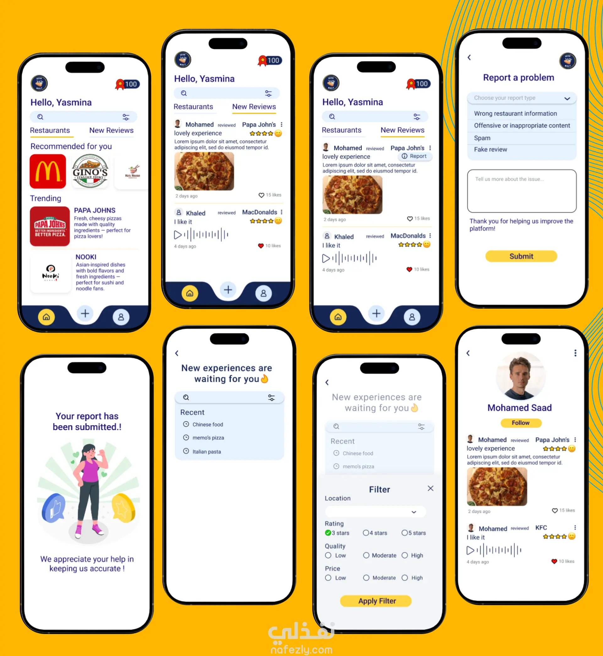 ركز التصميم على تجربة مريحة وبسيطة لعرض المطاعم، مع واجهة واضحة وسهلة الاستخدام تُمكّن المستخدم من تصفّح المطاعم، قراءة المراجعات، ومشاركة رأيه بسهولة.
