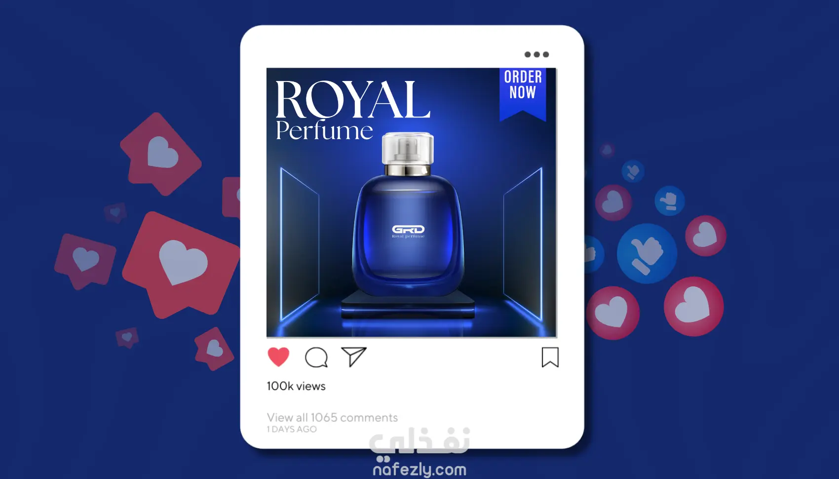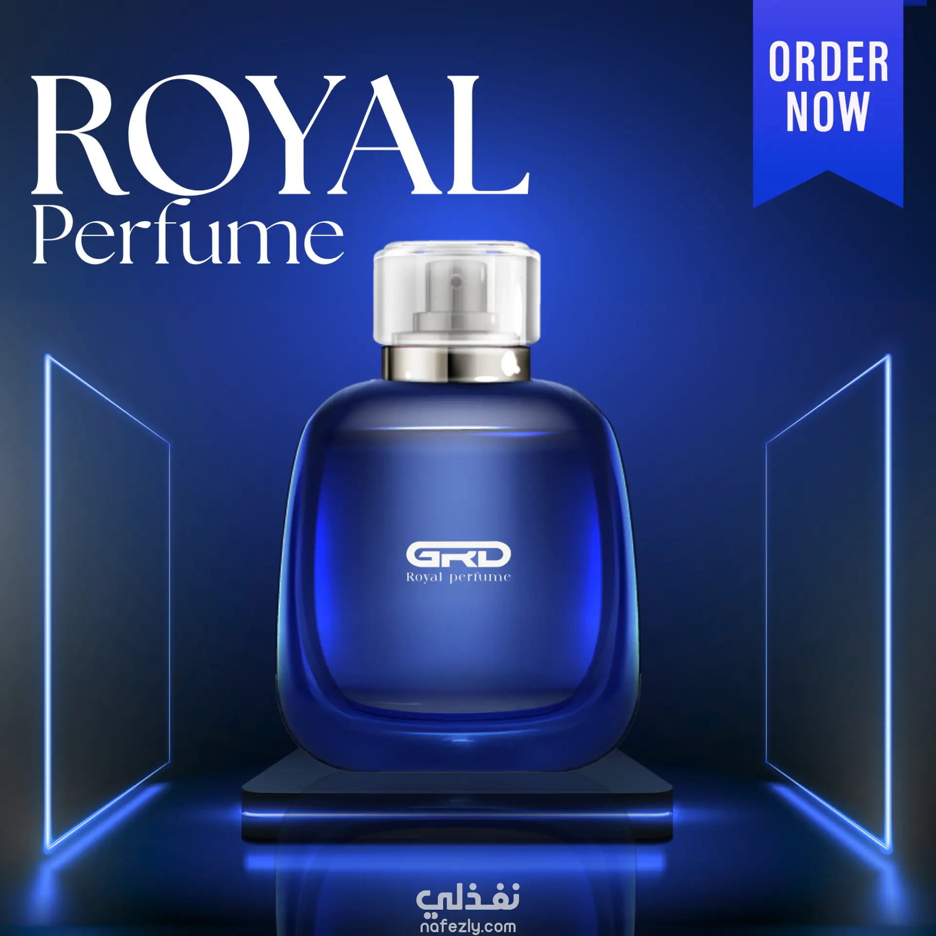 في التصميم ده ركزت على إبراز فخامة العطر وإحساس الفخامة الملكي اللي بيميز البراند اخترت اللون الازرق كلون أساسي لأنه من الوان العطر وكمان بيدي طابع راقي وهادي مع لمسات من الإضاءة الزرقاء الفاتحة عشان تضيف عمق وتخلي الزجاجة تبان كأنها بتلمع اعتمدت على تنسيق بسيط ونظيف يخلي العين تركز على العطر نفسه من غير أي عناصر عناصر مشتتة وده بيساعد المنتج يكون هو البطل في المشهد كلمة "ROYAL" بخط كبير وأنيق تعكس الرفاهية الستايل العام للتصميم فخم وراقي بيعكس شخصية العطر الفاخرة ومناسب لعلامة تجارية بتستهدف عشان الذوق الرفيع