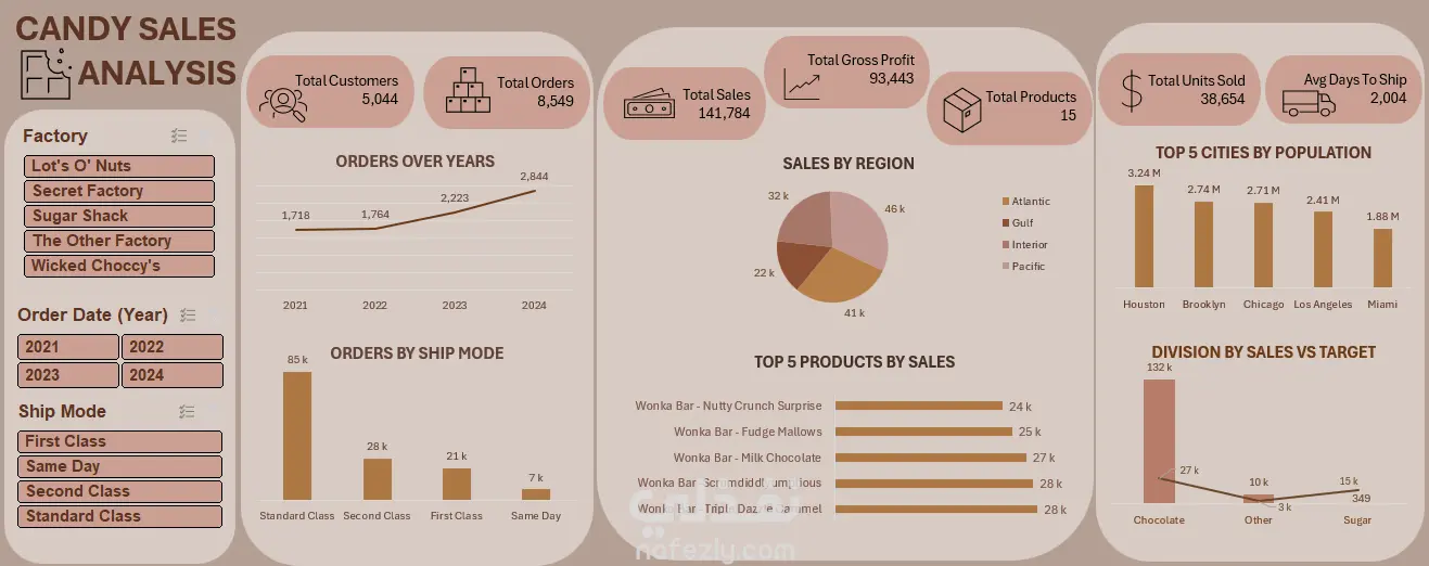 تحليل شامل لمبيعات الحلوى باستخدام Excel لاستخراج مؤشرات الأداء وإنشاء لوحة تحكم تفاعلية توضح النتائج