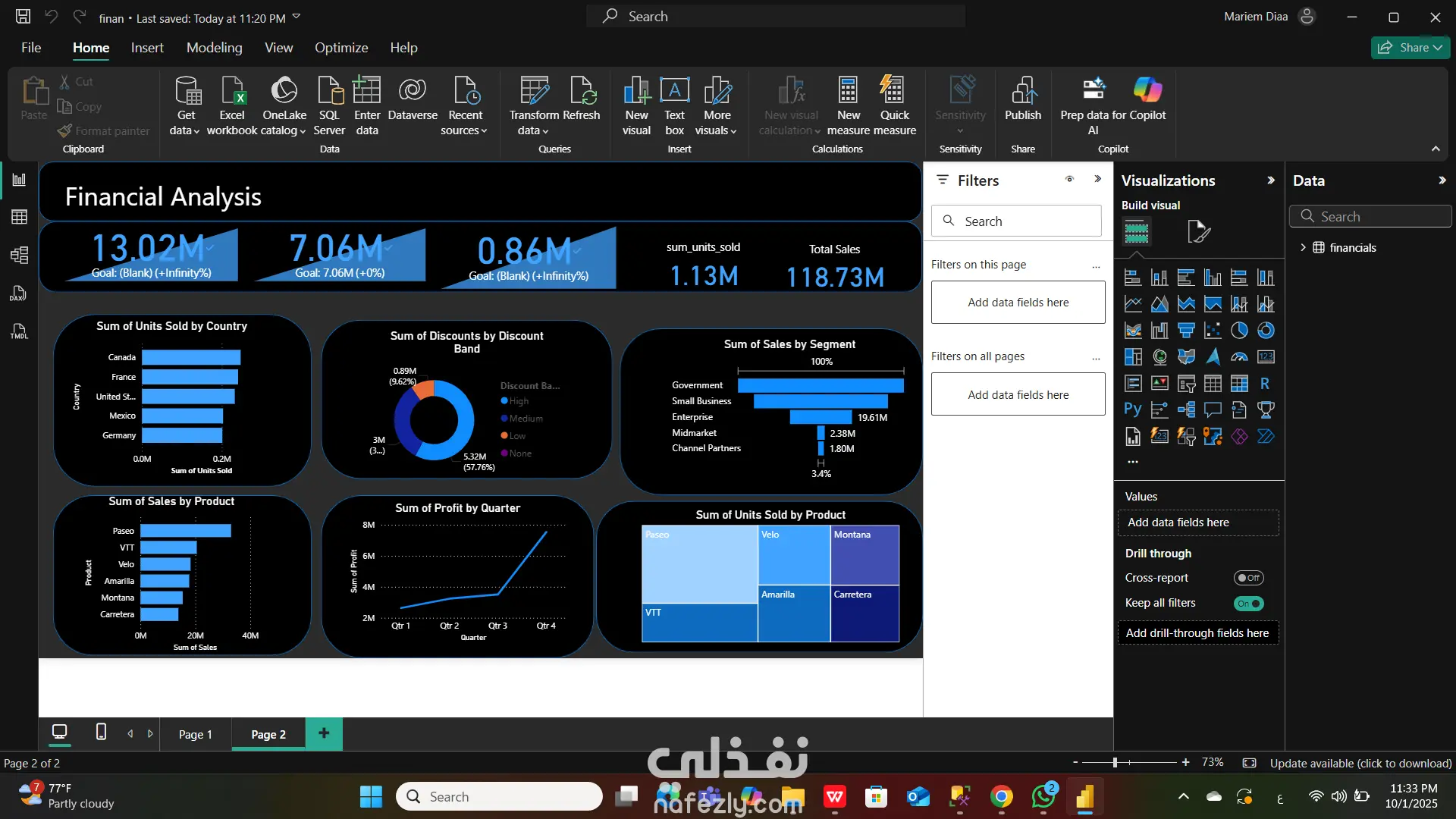 قمتُ بتنفيذ تحليل بيانات مالية (Financial Analysis) باستخدام أدوات تحليل البيانات، حيث تم تنظيف البيانات ومعالجتها واستخراج أهم المؤشرات المالية التي تساعد في اتخاذ القرارات. الإنجاز: إعداد داش بورد تفاعلي تعرض أهم المقاييس المالية بشكل واضح وبسيط. استخراج 6 إنسايتس مالية رئيسية (Key Insights) تُظهر أنماط واتجاهات في الأداء المالي. توضيح العلاقات بين الإيرادات، المصروفات، والأرباح. إبراز الفترات التي شهدت نموًا أو تراجعًا في الأداء المالي. استخدام تصورات (Visualizations) تسهّل فهم الأرقام المعقدة. القيمة المضافة: مساعدة الإدارة على اتخاذ قرارات مبنية على بيانات دقيقة. توفير رؤية شاملة عن الوضع المالي للشركة. إبراز النقاط التي تحتاج تحسين أو فرص الاستثمار المستقبلية.