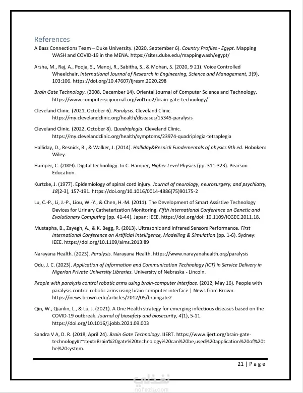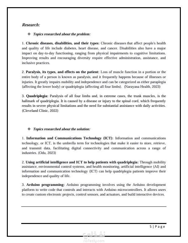 النوع: كتابة بحث علمي بالانجليزية. الهدف من البحث تحسين حياة أصحاب الشلل الرباعي باستخدام الذكاء الاصطناعي. تم البحث الشامل عن مختلف المعلومات الخاصة بالمجال و استخدامها لحل المشكلة، وتمت اضافتها بطريقة احترافية في البحث العلمي و اضافة المراجع باستخدام احدث معايير ال