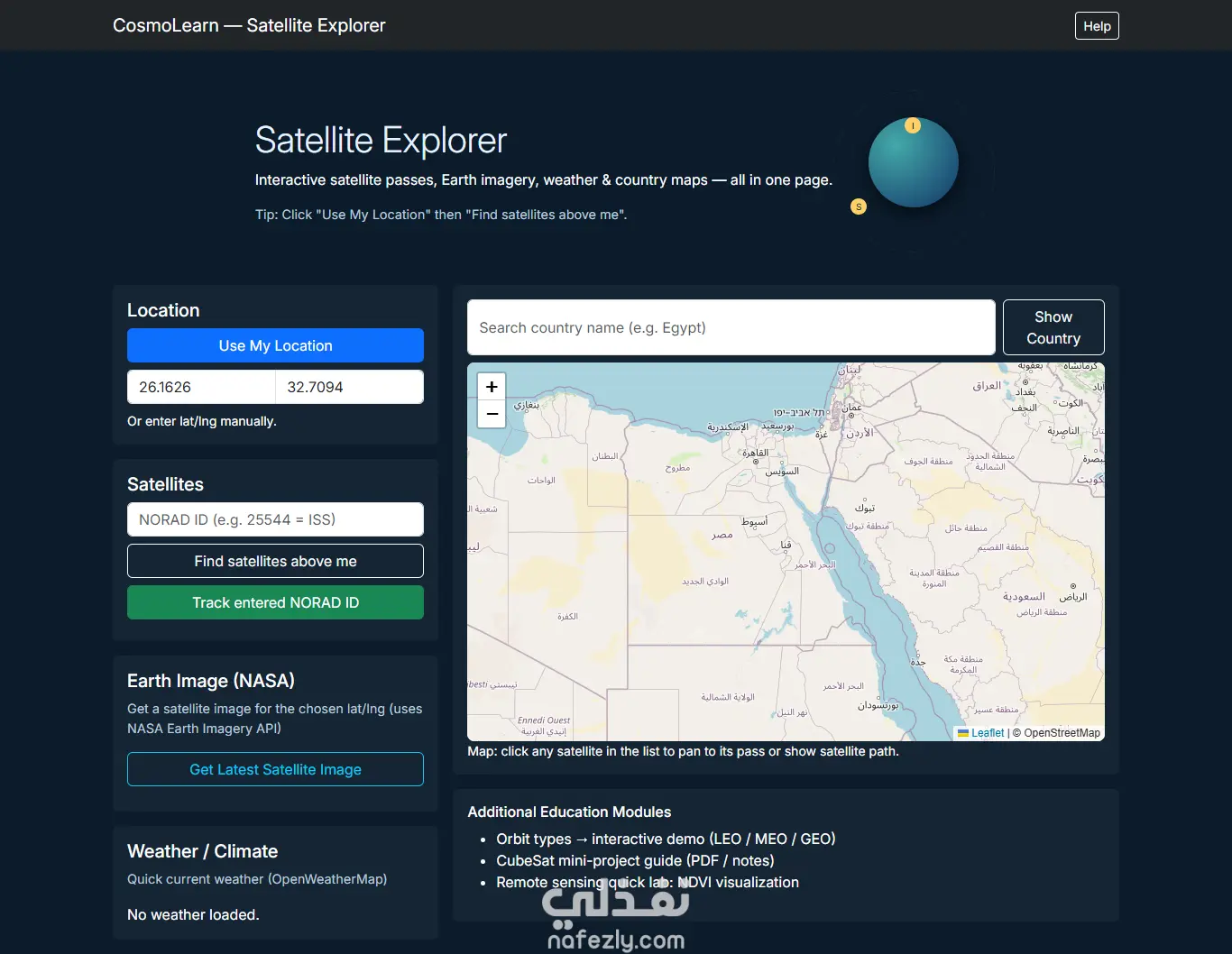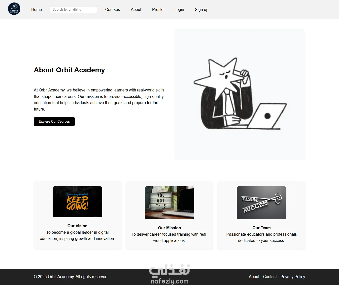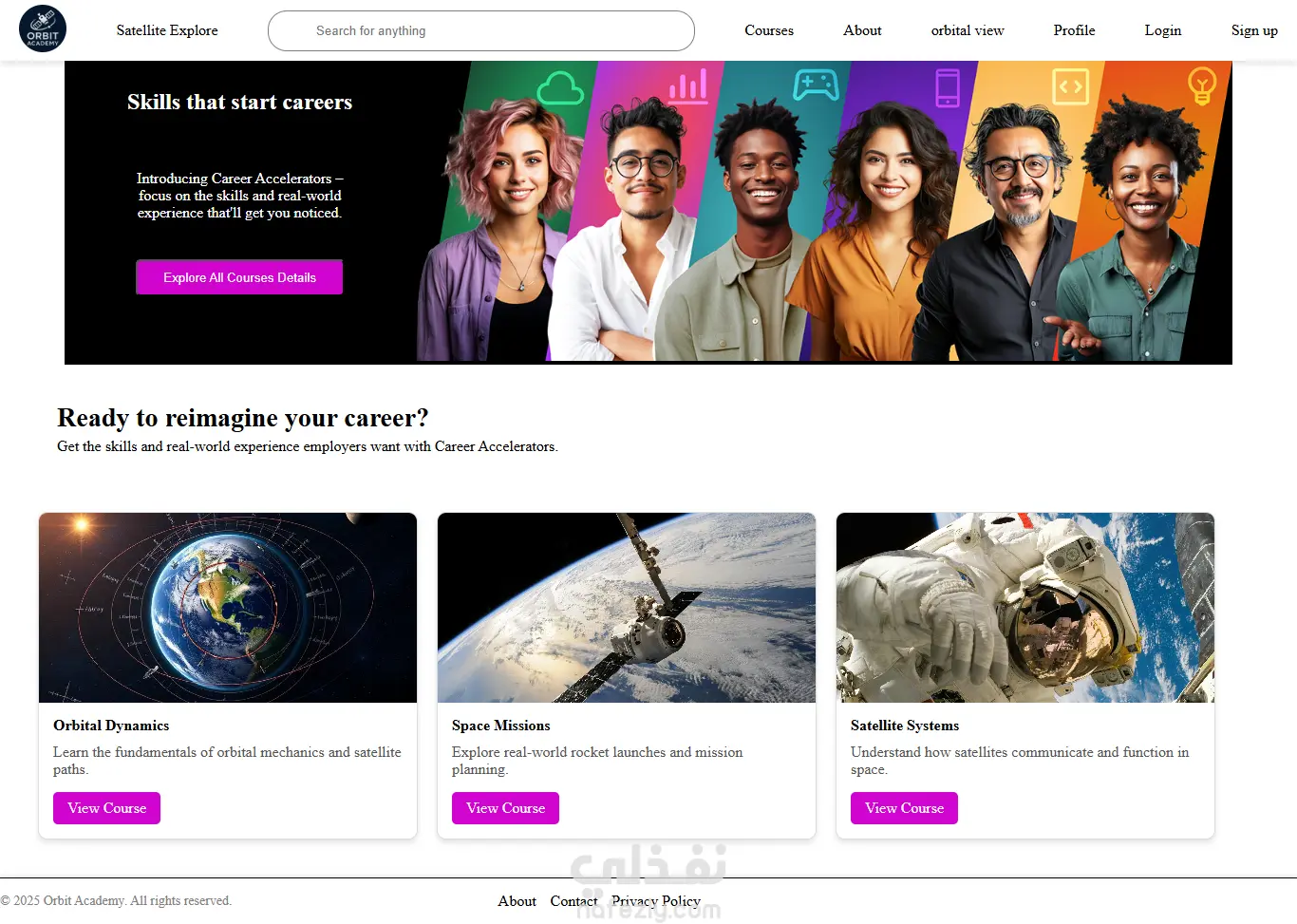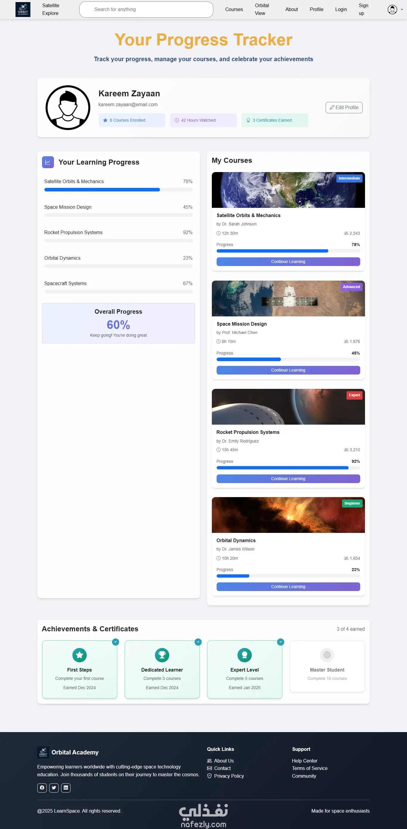 المشروع عباره عن منصه تعليميه متخصصه فى الفضاء والتكنولوجيا الفضائيه وبتقدم مسارات تدريبيه تفاعليه فى مواضيع زى ميكانيكا المدارات , المهمات الفضائيه .قمت بتصميم وتطوير موقع باستخدامBootstrap , HTML5, CSS3, وJavaScript مع تصميم عصري ومتجاوب.