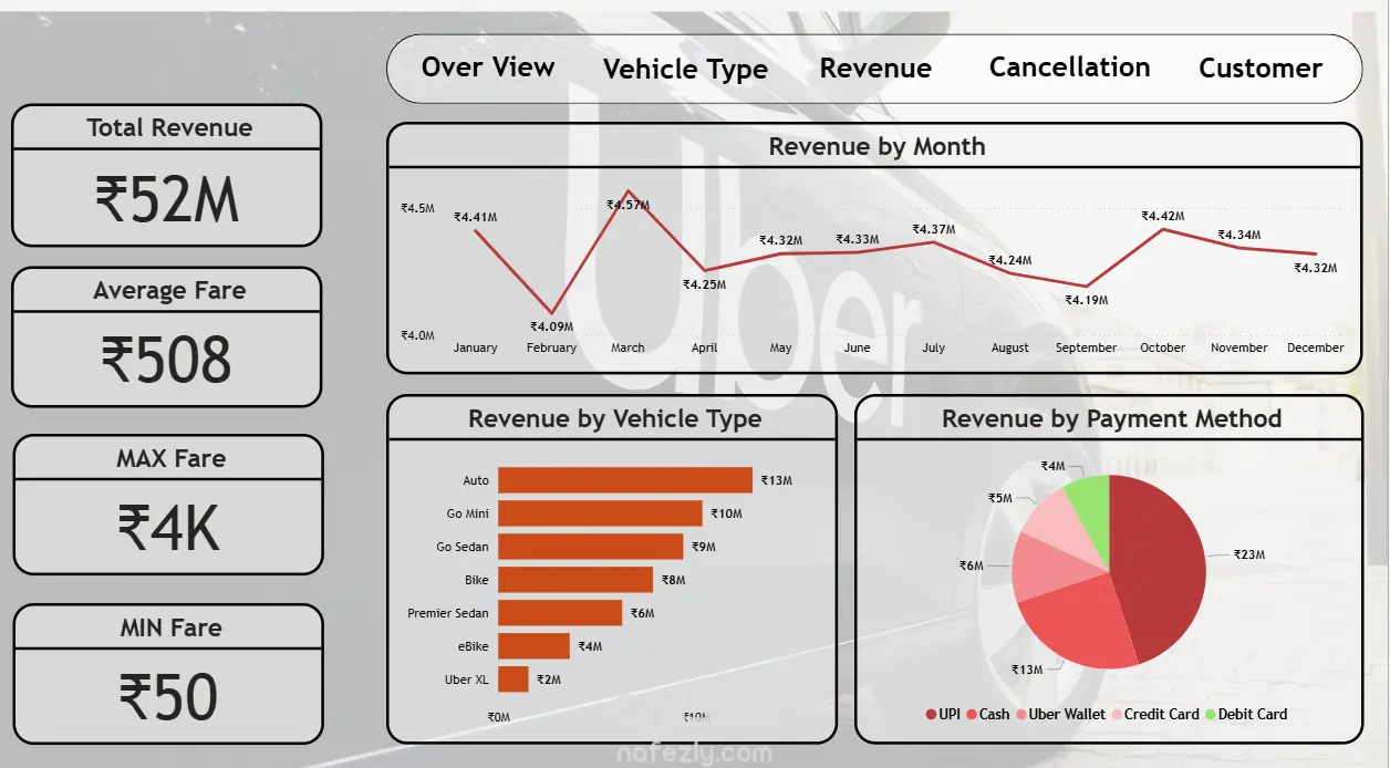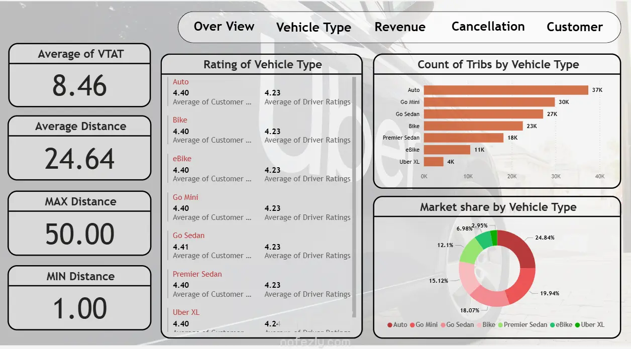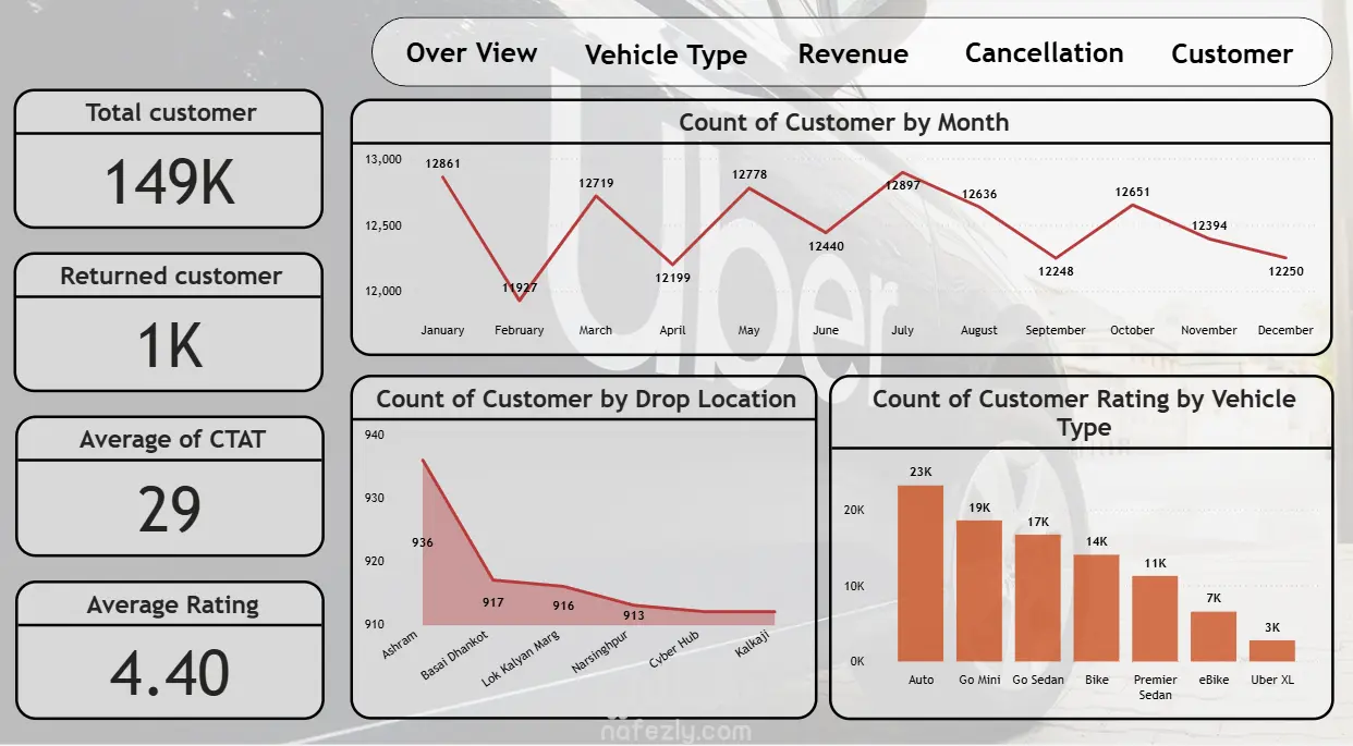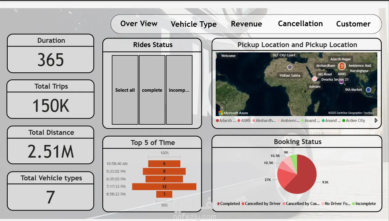 تم إنشاء لوحة تحكم تفاعلية (Dashboard) لتحليل بيانات شركة Uber باستخدام Power BI، بهدف توفير نظرة شاملة حول أداء الرحلات، الإيرادات، العملاء، وأنواع المركبات.
