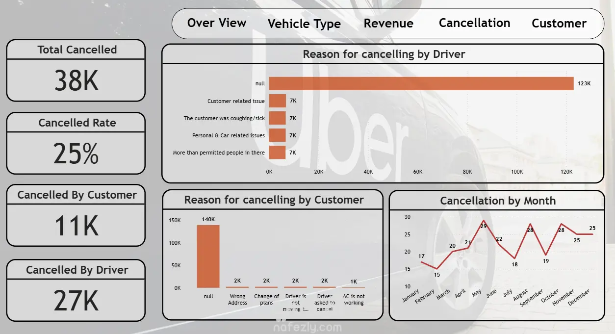 Cancellations: عرض نسب وأسباب الإلغاء لفهم سلوك المستخدمين والسائقين.