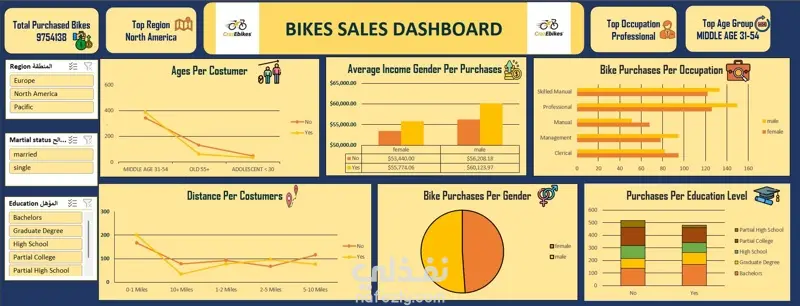 قمت بتصميم وتطوير لوحة تحكم تفاعلية باستخدام Excel لتحليل بيانات مبيعات الدراجات.