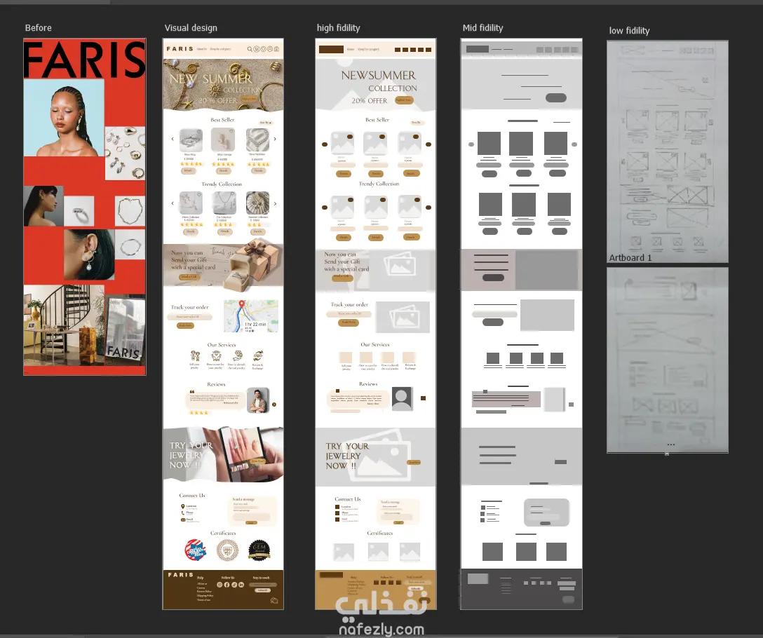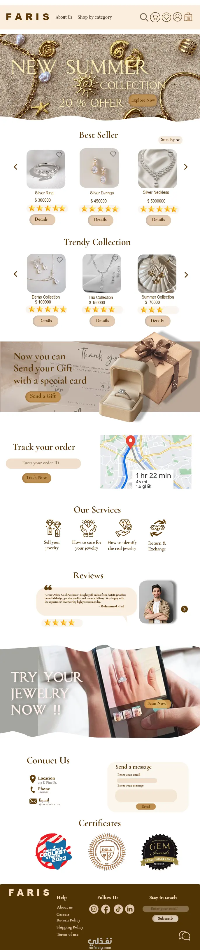تم تصميم صفحة الهبوط لمتجر FARIS Jewelry بأسلوب عصري وأنيق يعكس هوية العلامة التجارية الفاخرة. لقد قمت بانشاء العمل كامل باستخدام برنامج photoshop , وتنفيذ جميع مراحل ال ux لاضمن تجربة مستخدم بسيطة وسهلة تشمل احتياجاته وتضمن راحته . تتضمن الصفحة عرضًا لأفضل المبيعات والمجموعات العصرية وخدمات المتجر مع إمكانية تتبع الطلبات وآراء العملاء. يركز التصميم على تجربة مستخدم سلسة تجمع بين الجمال البصري والوظائف المتكاملة لتعزيز ثقة العملاء وجاذبية المتجر.