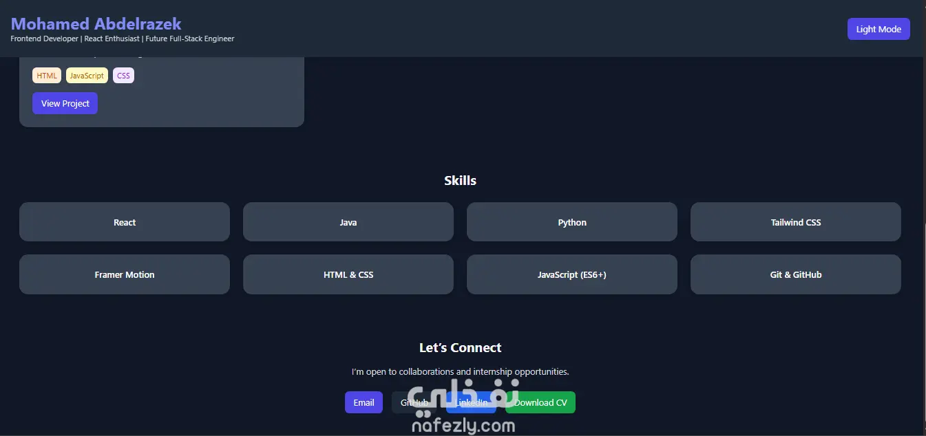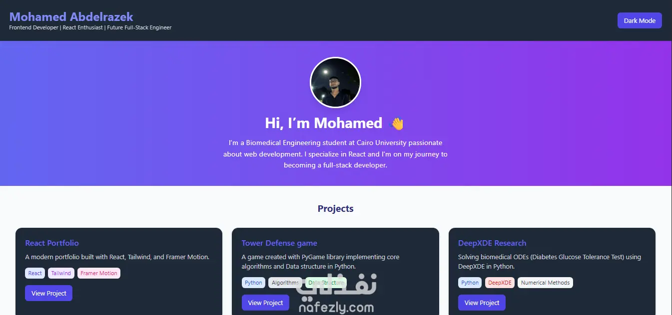 تقديم صورة احترافية عنك كمطور Frontend عرض المشاريع التي نفذتها بطريقة منظمة وسهلة الوصول تمكين المهتمين (عملاء، جهات توظيف) من التواصل معك بسهولة إبراز مهاراتك في التصميم والبرمجة والعرض جعل الموقع متجاوب مع جميع الأحجام (موبايل، تابلت، ديسكتوب)