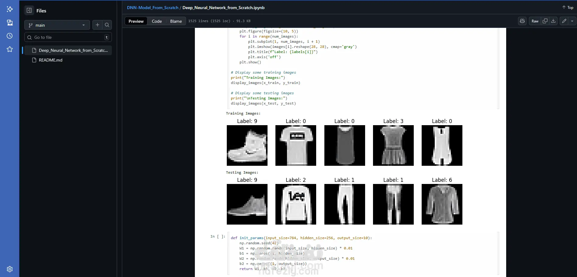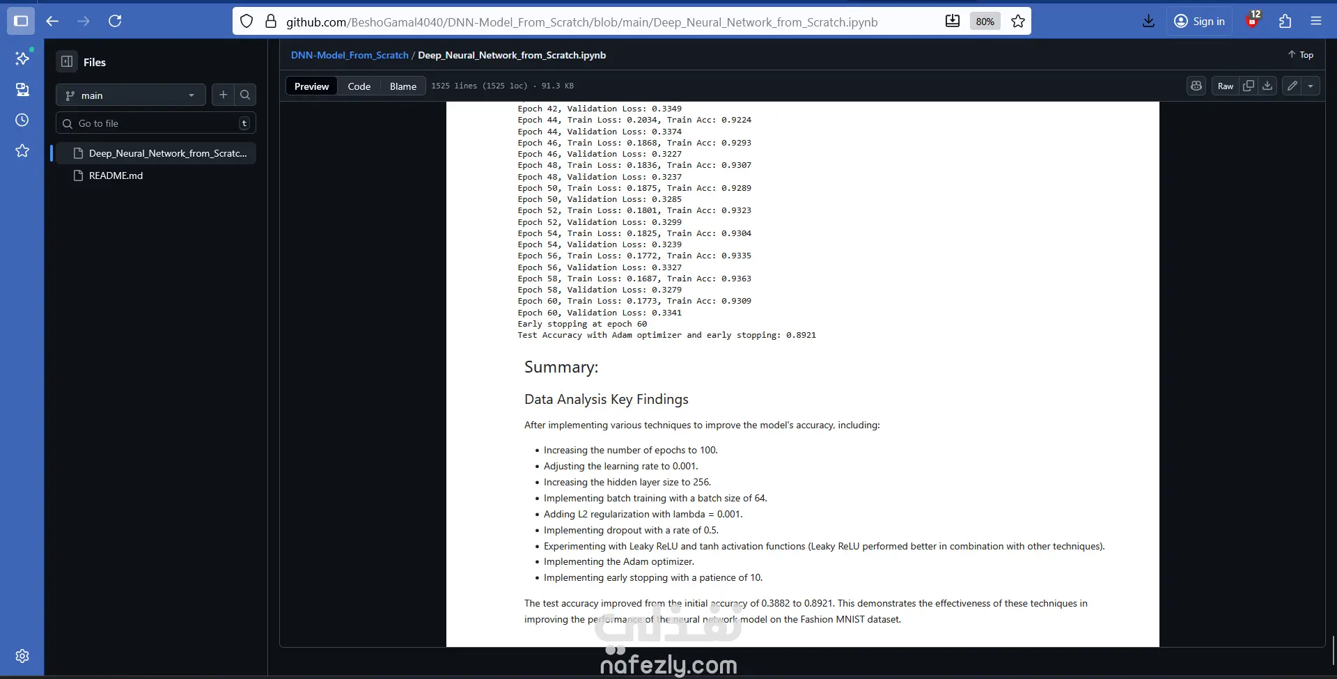 في هذا المشروع، قمت بتصميم وتطبيق شبكة عصبية عميقة (Deep Neural Network) من الصفر — بمعنى أنني لم أستخدم أطر جاهزة مثل PyTorch أو TensorFlow في بناء النموذج، باستثناء استخدام TensorFlow فقط لتحميل مجموعة بيانات Fashion MNIST. GitHub مكونات المشروع والمهام التي قمت بها استخدام مجموعة بيانات Fashion MNIST لتصنيف صور الأزياء (10 فئات). GitHub بناء شبكة عصبية مكوّنة من طبقتين (2-layers) باستخدام NumPy فقط للتحكم اليدوي في العمليات الرياضية (المضروب، الانحدار العكسي، الخ) دون الاعتماد على مكتبات التعلم العميق الجاهزة. GitHub تنفيذ عمليات المعالجة والتدريب الأساسية: • تهيئة الأوزان والانحيازات • الانتشار الأمامي (forward propagation) • حساب دالة الخسارة (loss function) • الانتشار العكسي (backpropagation) لتحديث الأوزان تحسين النموذج: • تجربة سرعات التعلم (learning rates) مختلفة • استخدام عمليات تجزئة الدفعات (batch training) لتثبيت الأداء وتحسين الاستقرار • إضافة تنظيم L2 (L2 regularization) لمنع الإفراط في التعلّم (overfitting) • تنفيذ تقنية Dropout في الطبقة المخفية لتخفيف الإفراط في التعلّم • تقييم استخدام دوال تنشيط مختلفة مثل ReLU و Leaky ReLU و tanh • تنفيذ محسن Adam optimizer بديل لانحدار التدرّج البسيط • تطبيق التوقف المبكر (early stopping) بناءً على أداء التحقق (validation) لتجنب الإفراط في التعلّم GitHub تقييم النموذج بحساب الدقة (accuracy) أو غيرها من مقاييس الأداء على مجموعة الاختبار التقنيات والأدوات المستخدمة لغة Python مكتبة NumPy (للعمليات الحسابية الأساسية) Matplotlib و مكتبات الرسوم البيانية لعرض النتائج (تمثيل الأداء عبر العصرات) استخدام TensorFlow فقط لتحميل مجموعة بيانات Fashion MNIST (وليس لبناء النموذج) GitHub التنظيم الجيد للمشروع ضمن Jupyter Notebook (ملف .ipynb) مع توثيق منطقي ومتابعة واضحة لخطوات التنفيذ القيمة التي يضيفها المشروع يُظهِر فهمًا عميقًا لآلية عمل الشبكات العصبية من المستوى الأدنى، وليس الاعتماد على مكتبات جاهزة يُعدّ مرجعًا تقنيًا لشرح مفصل لكيفية تنظيم الانتشار الأمامي والعكسي والتحديث اليدوي للأوزان يمكن استخدامه كأساس لتوسعات مستقبلية (كإضافة المزيد من الطبقات، التحسينات، أو الانتقال لاستخدام أطر جاهزة بعد الفهم النظري) يُعطي العميل ثقة في قدراتك على بناء نماذج ذكاء اصطناعي متكاملة وفهم الأُسُس النظرية plus التطبيقية