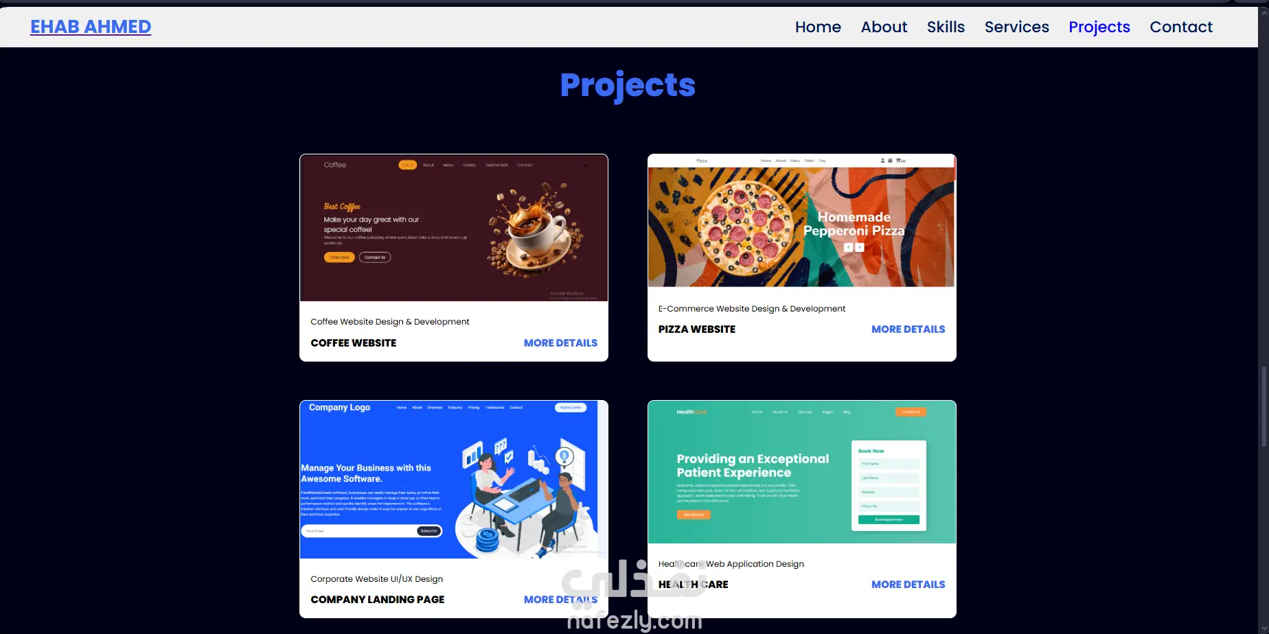 عرض المشاريع السابقة بشكل منظم واحترافي في شبكة (Grid Layout) أو نمط معرض (Gallery).