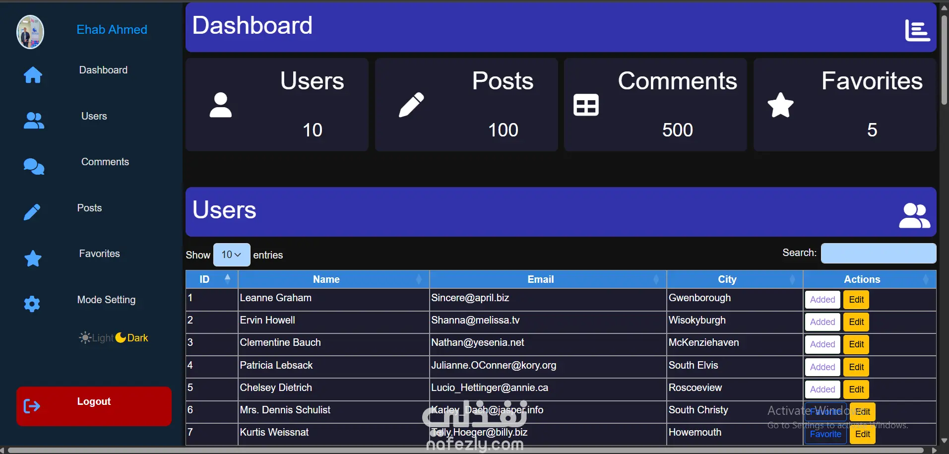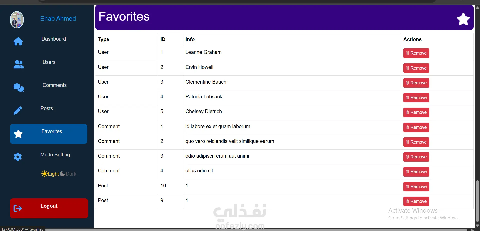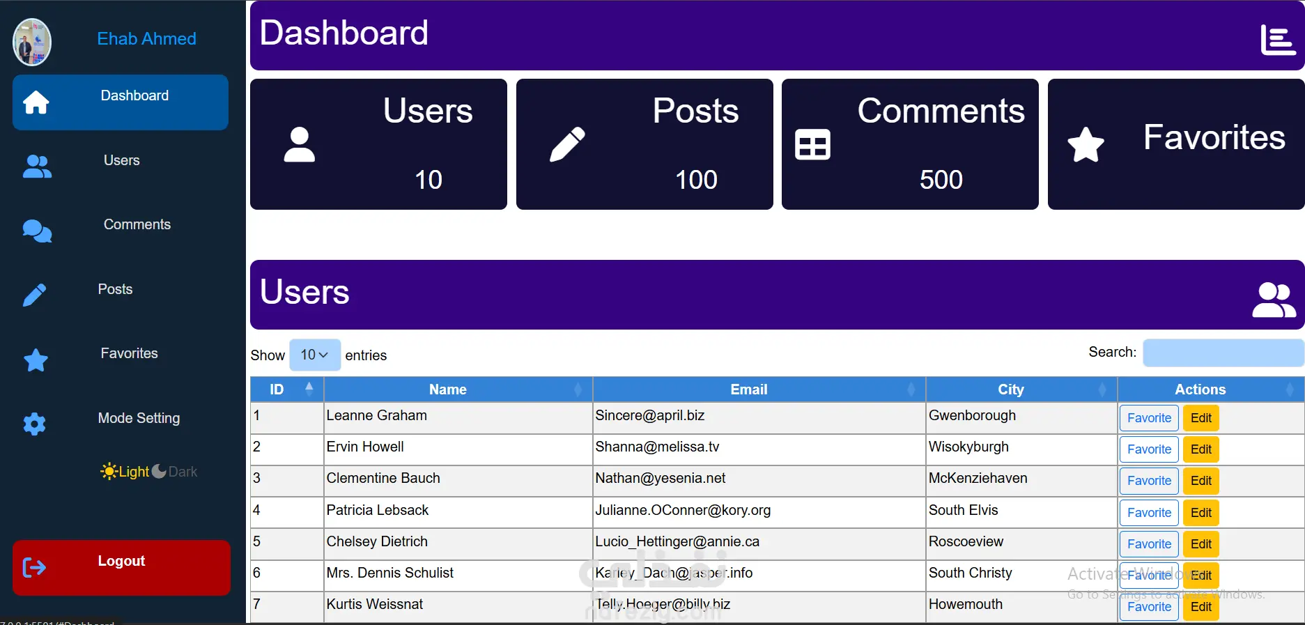 أنشأت واجهة متجاوبة وديناميكية تدعم التفاعل مع العناصر المختلفة، مع الاهتمام بجمالية التصميم وسهولة التنقل بين الصفحات. قمت ببناء صفحات مخصصة لإدارة البيانات والمراقبة والتحليلات بشكل منظم وواضح، وتشمل هذه الصفحات: إدارة المستخدمين (Users)، المشاركات (Posts)، التعليقات (Comments)، المفضلات (Favorites)، وإعدادات الوضع الليلي أو النهاري (Mode Setting – Light/Dark).