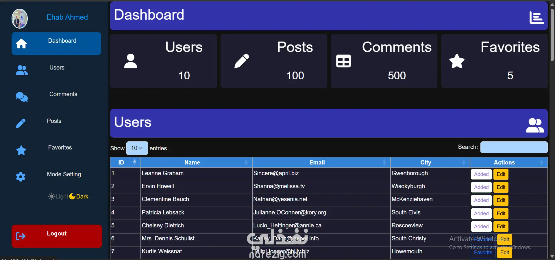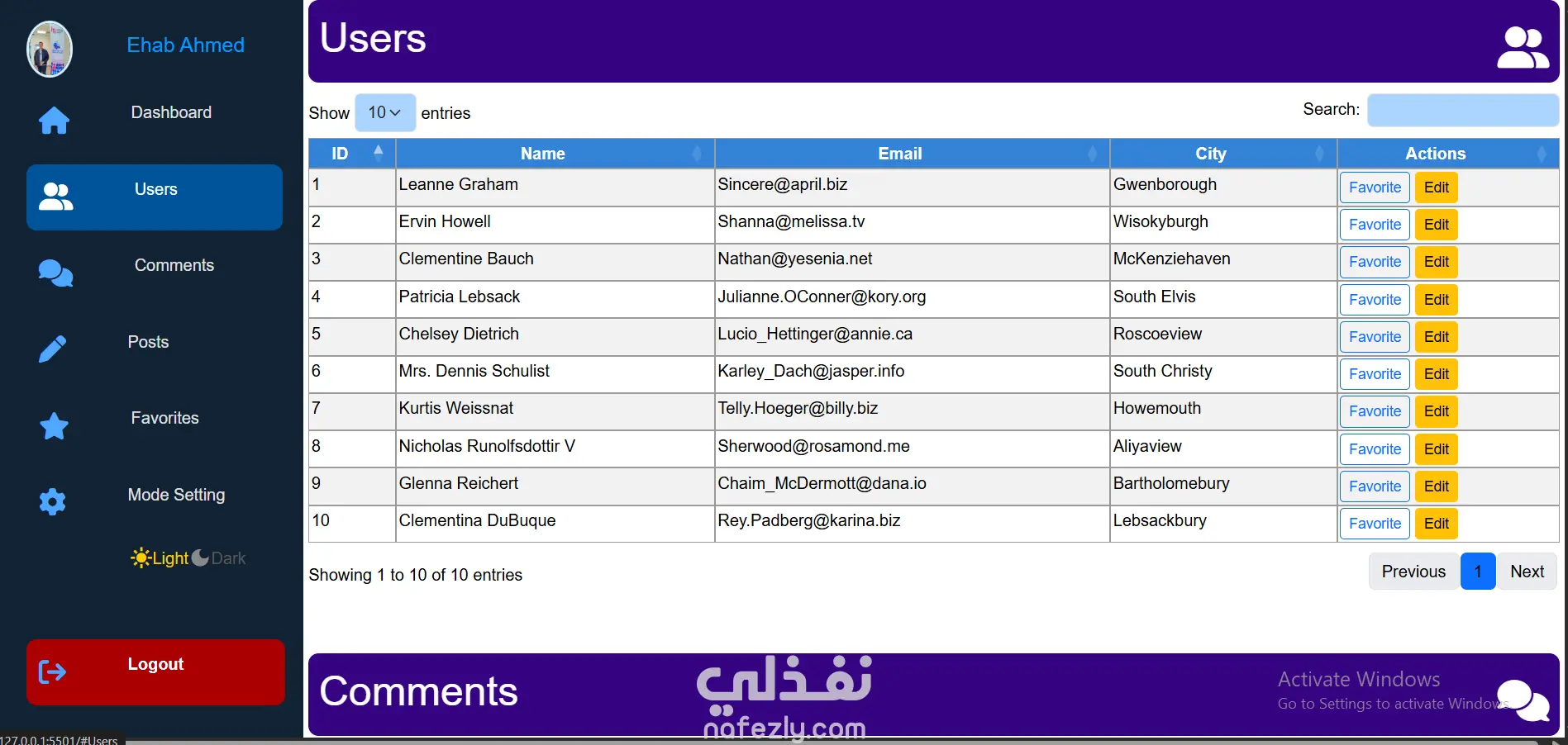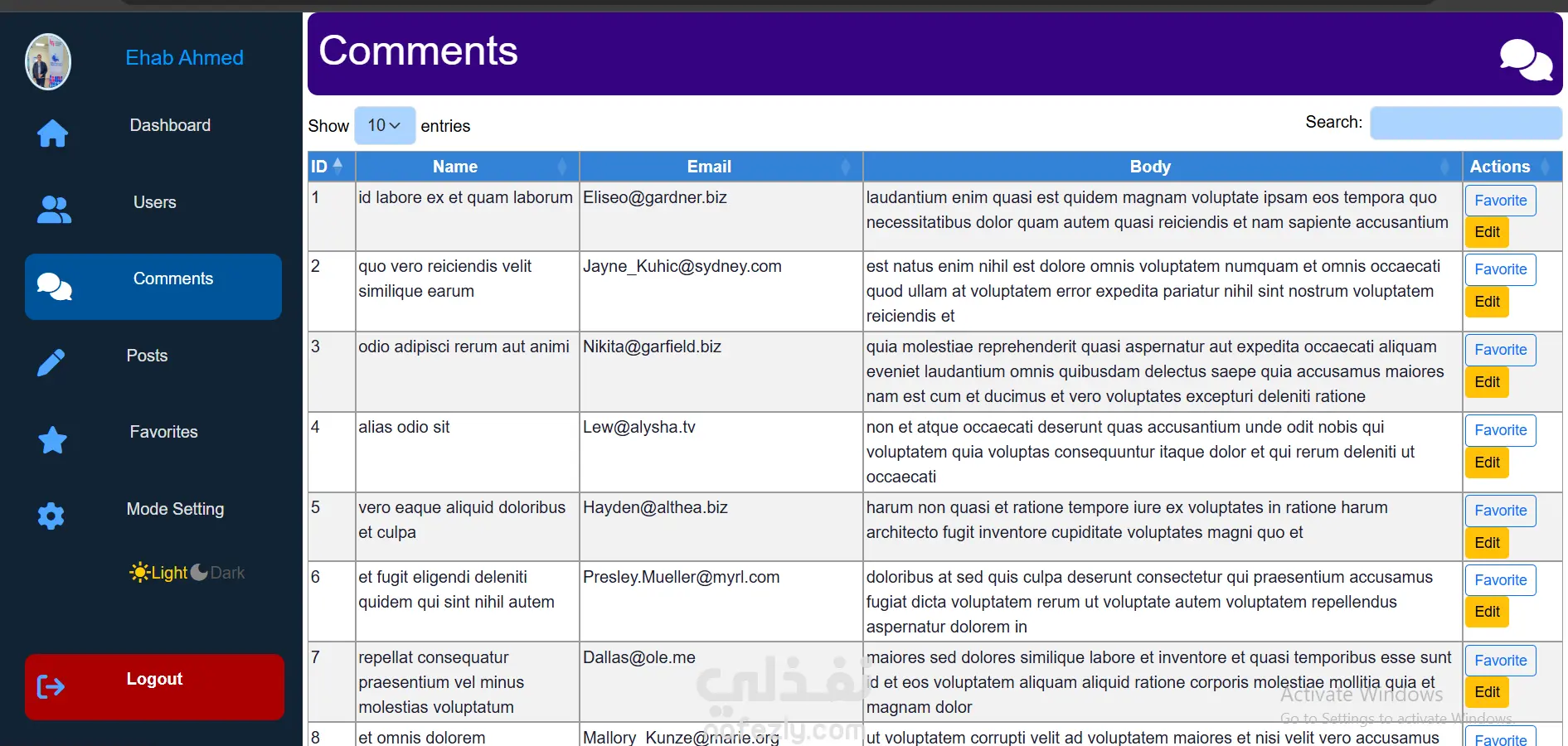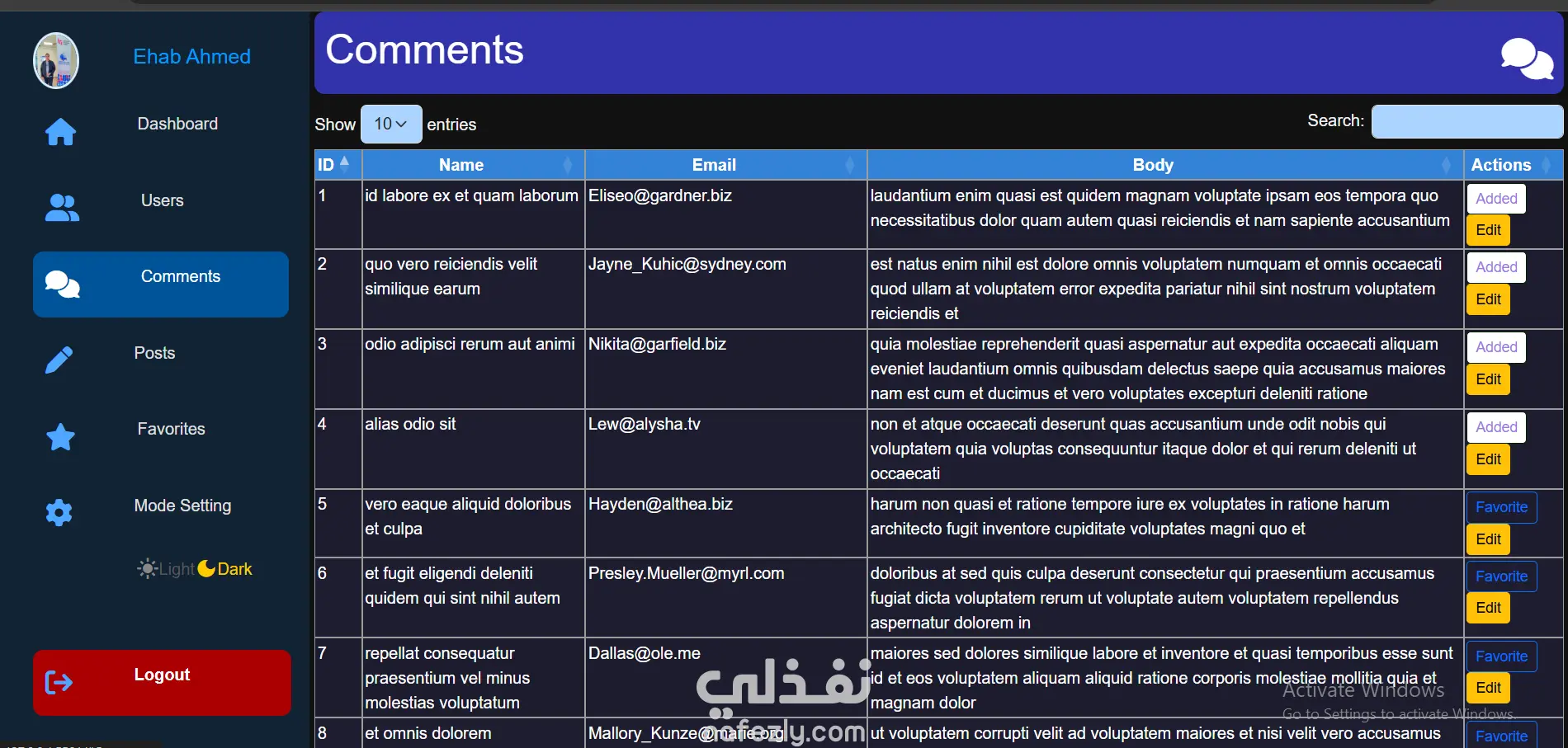 أنشأت واجهة متجاوبة وديناميكية تدعم التفاعل مع العناصر المختلفة، مع الاهتمام بجمالية التصميم وسهولة التنقل بين الصفحات. قمت ببناء صفحات مخصصة لإدارة البيانات والمراقبة والتحليلات بشكل منظم وواضح، وتشمل هذه الصفحات: إدارة المستخدمين (Users)، المشاركات (Posts)، التعليقات (Comments)، المفضلات (Favorites)، وإعدادات الوضع الليلي أو النهاري (Mode Setting – Light/Dark).