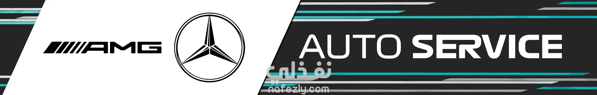 A banner for a service center for mercedes cars the banner features the mercedes and amg logo with the centers' name next to it with the mercedes color scheme on the whole banner