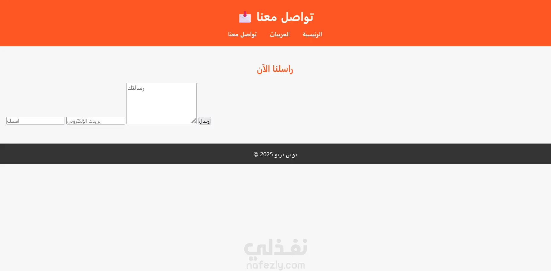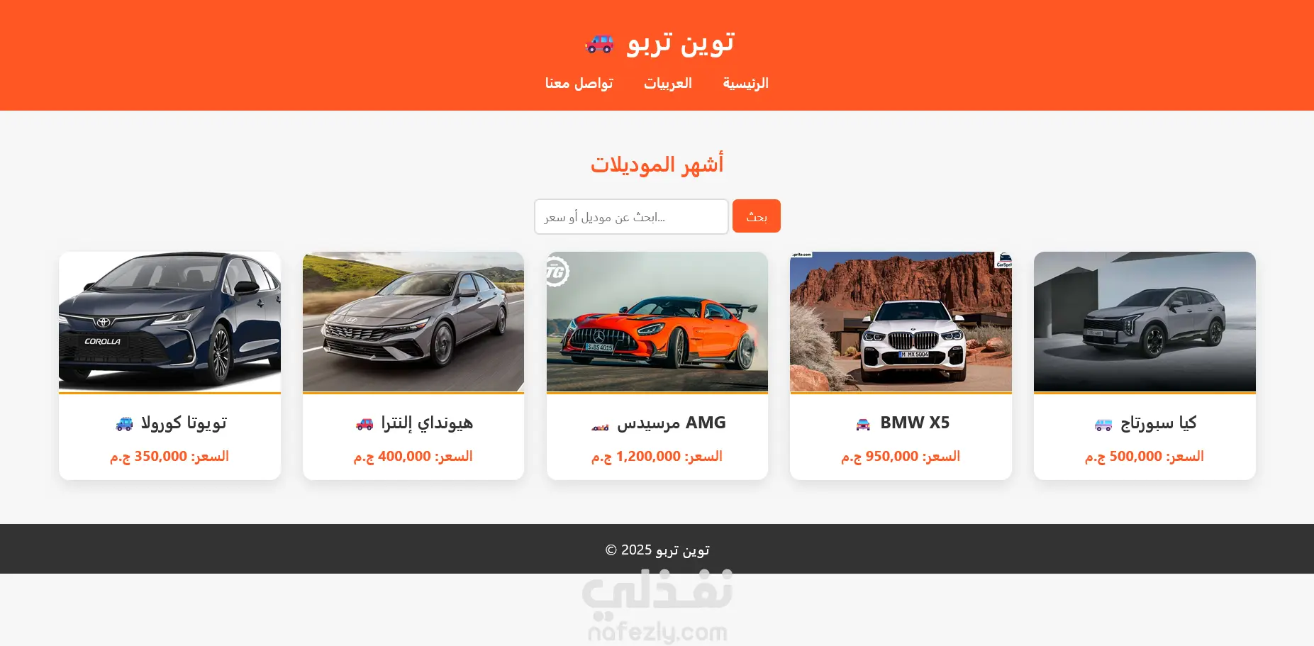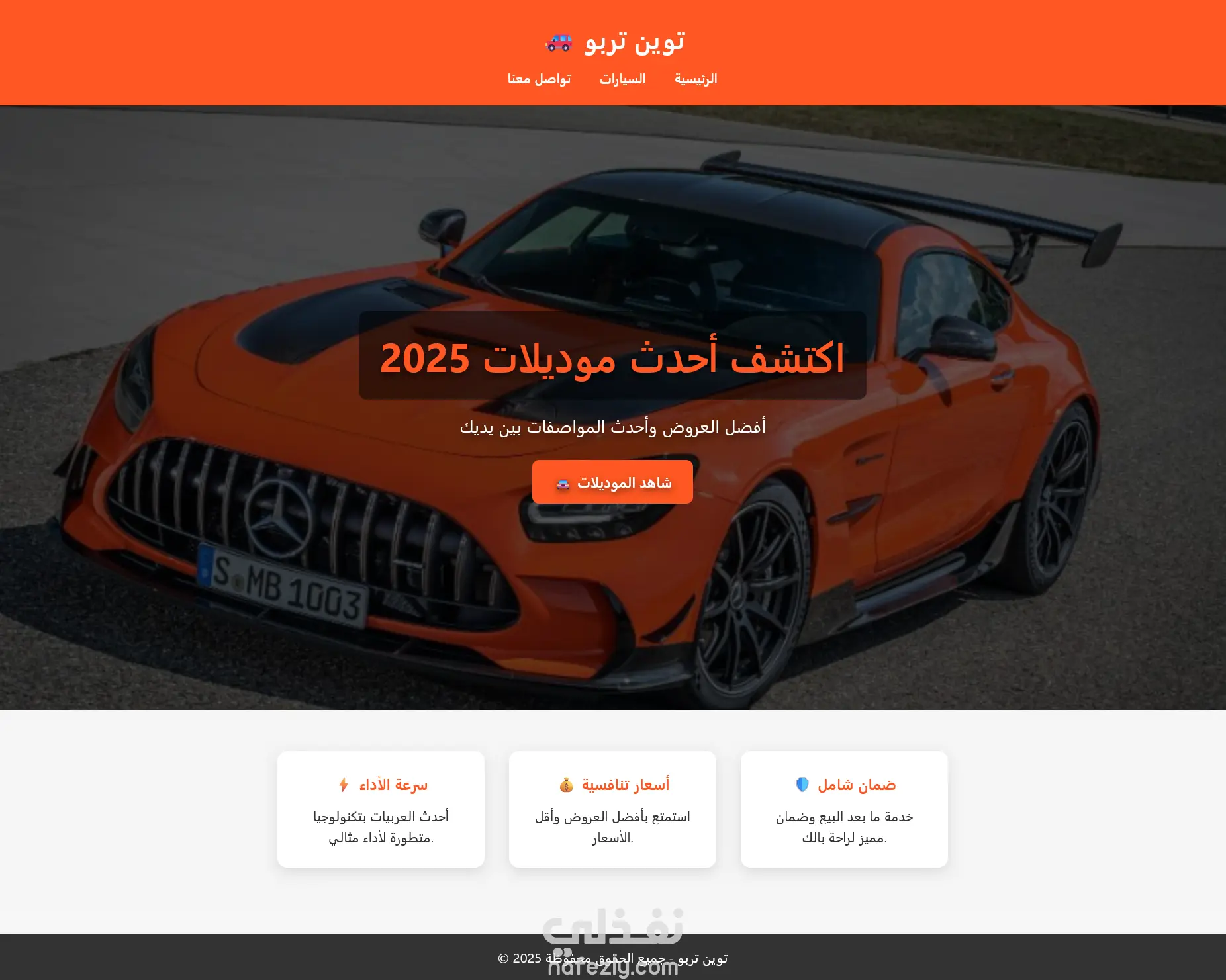 موقع توين تربو هو منصة إلكترونية بسيطة وجذابة لعشاق السيارات، يقدم تجربة مميزة لعرض أحدث موديلات 2025 وأكثرها شهرة. ستجد في الموقع: ️ صور عالية الجودة لمختلف الموديلات العالمية. معلومات عن الأسعار لتساعدك في المقارنة واتخاذ القرار. خاصية البحث للعثور بسرعة على السيارة المناسبة. صفحة تواصل معنا لطرح استفساراتك أو طلب المزيد من التفاصيل. الموقع مصمم بواجهة سهلة الاستخدام، ألوان عصرية، وتجربة سلسة سواء كنت تستخدم الهاتف أو الكمبيوتر. هدفنا أن نضع عالم السيارات بين يديك بطريقة أنيقة وبسيطة.