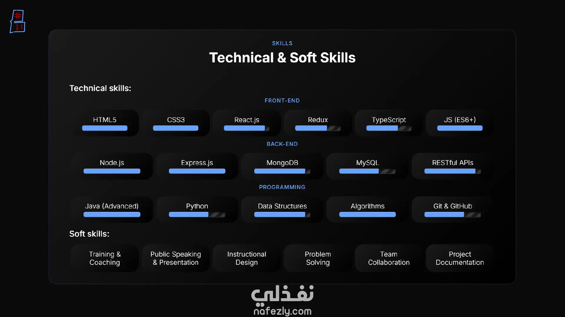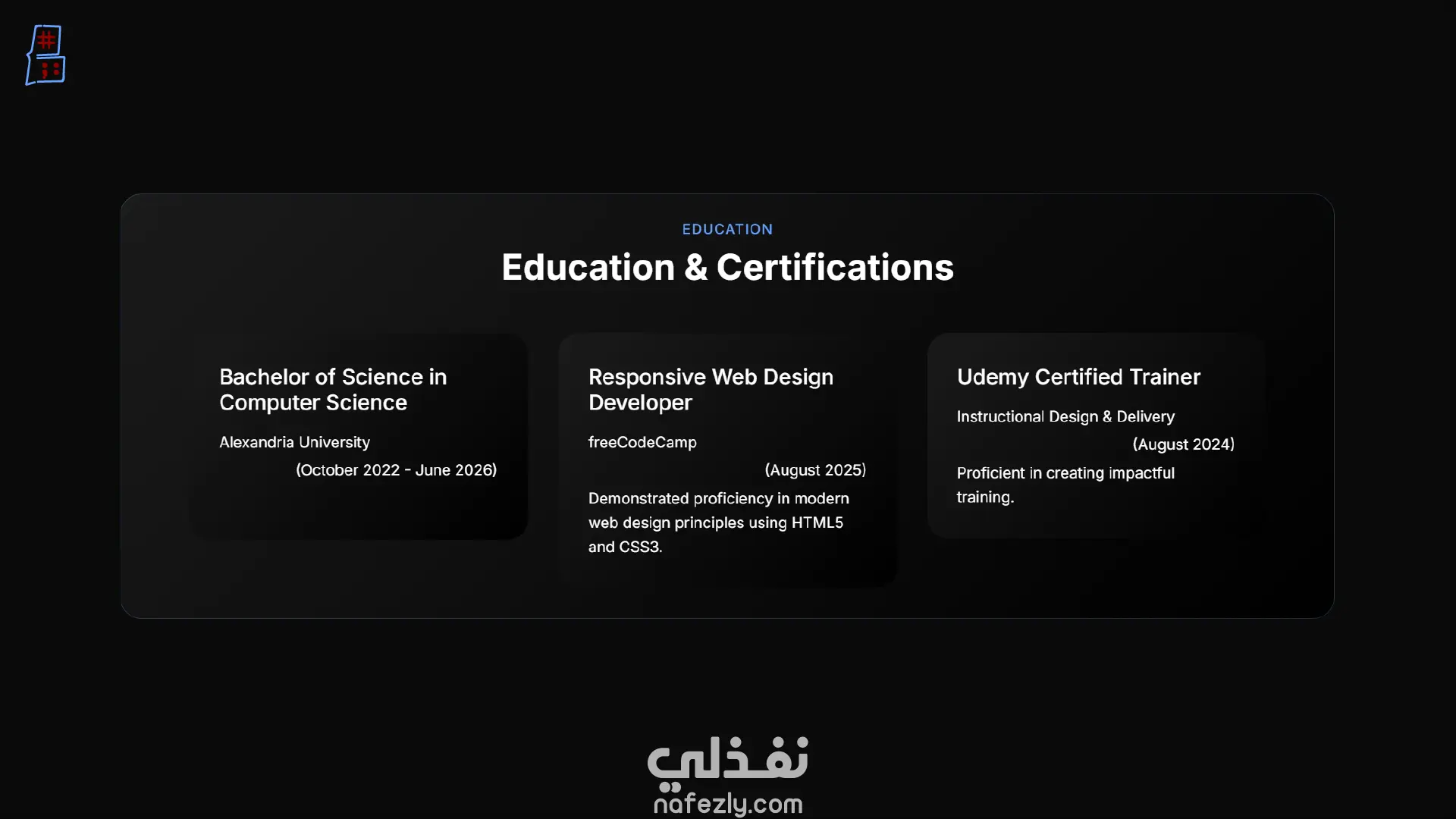 هيكلية محتوى شاملة: ينقسم الموقع إلى أقسام منظمة بعناية لعرض المسيرة المهنية بشكل كامل، وتشمل: نبذة عني، التعليم، المهارات، الخبرات، الخدمات، المشاريع، الإنجازات، آراء العملاء.