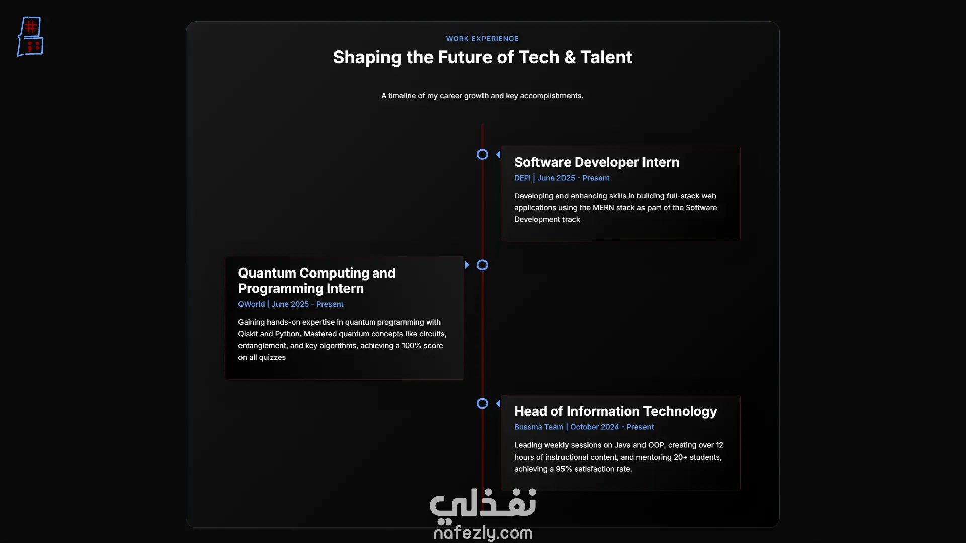 هذا المشروع هو موقعي الشخصي، وهو بمثابة ملف أعمال رقمي تم تصميمه وتطويره لعرض مهاراتي، خبراتي، ومشاريعي كمطور ويب. تم بناء الموقع بأحدث تقنيات الويب مع التركيز على تقديم تصميم نظيف ومتجاوب، وتجربة مستخدم تفاعلية تترك انطباعًا إيجابيًا واحترافيًا لدى العملاء ومديري التوظيف.