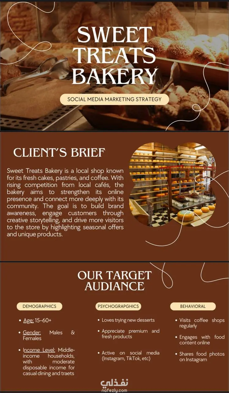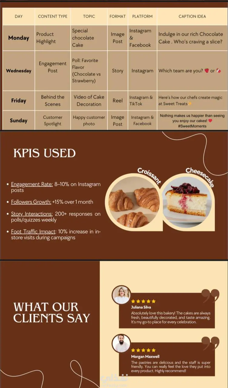 أنا أقدّم خدمة شاملة لإعداد استراتيجية سوشيال ميديا مصممة خصيصًا للمخابز والحلويات، تساعدك على بناء حضور قوي على المنصات الرقمية، جذب عملاء جدد، وزيادة المبيعات. الخدمة تغطي كل خطوة من تحليل السوق إلى تنفيذ الخطة والمحتوى الإبداعي. الذي سأقدمه للعميل: - تحليل السوق والجمهور: دراسة المنافسين على السوشيال ميديا. تحليل الجمهور المستهدف (Demographics, Psychographics, Behaviors). تحديد الفرص الفريدة التي يمكن للمخبز استغلالها. - تحديد أهداف الاستراتيجية: زيادة الوعي بالعلامة التجارية. تعزيز التفاعل مع العملاء. تحفيز المبيعات (Online & Offline). بناء ولاء العملاء. - تخطيط المحتوى: إعداد Content Calendar شهري/أسبوعي. اختيار أنواع المحتوى: صور منتجات، فيديوهات قصيرة، Reels، Stories، محتوى تعليمي أو ترفيهي. صياغة رسائل تسويقية جذابة ومتناسقة مع هوية المخبز. - اختيار منصات النشر: تحديد المنصات الأكثر فعالية (Instagram, Facebook, TikTok…). وضع جدول نشر مناسب لكل منصة لتحقيق أفضل نتائج. - اقتراح أساليب التفاعل والتحفيز: مسابقات وتحديات على السوشيال ميديا. عروض وخصومات مخصصة للمتابعين. دعوات للتفاعل (Comments, Shares, DMs). - تحديد KPIs وقياس الأداء: متابعة التفاعل، نمو المتابعين، الوصول، وعدد المبيعات الناتجة عن الحملة. تقديم تقارير دورية مع توصيات لتحسين الأداء. - دعم وتوجيه: نصائح لإنشاء المحتوى بشكل احترافي. توصيات لاستخدام أدوات تصميم سهلة مثل Canva وCapCut.