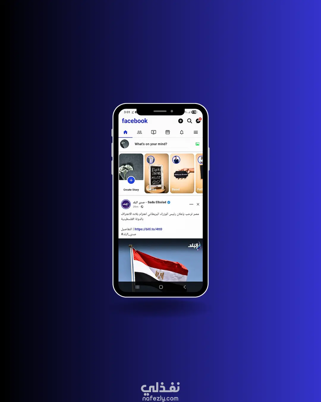تبويب (Navigation Bar) للتنقل بين الأقسام (Home – Videos – Marketplace – Notifications – Menu).
