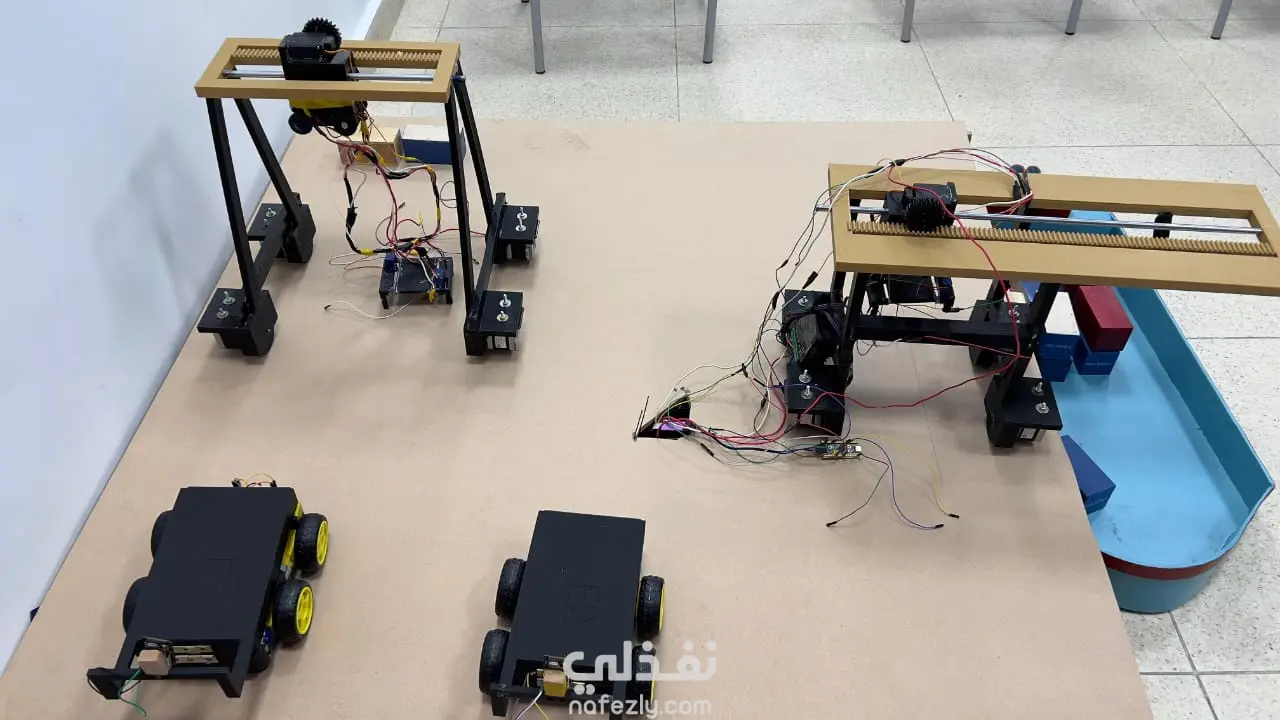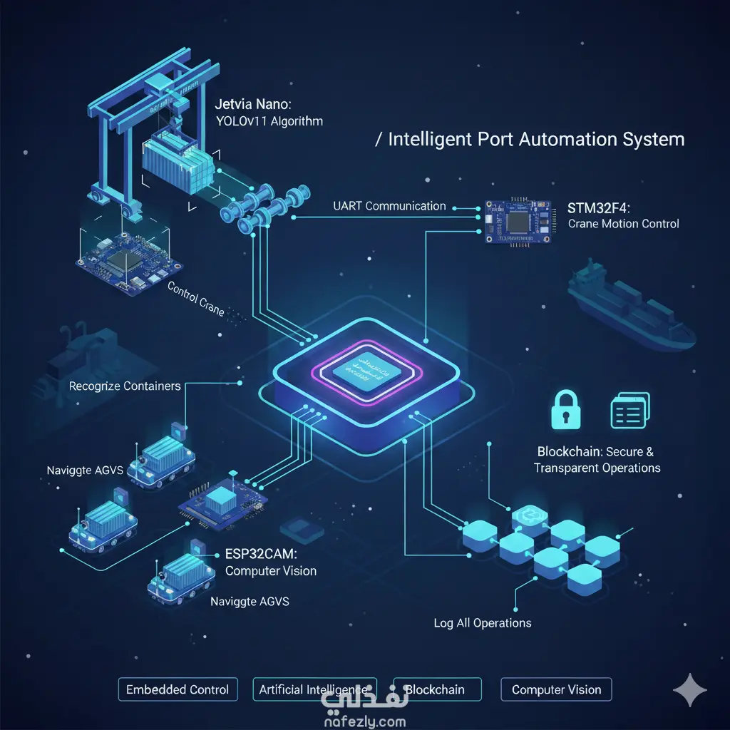 نظام أتمتة ذكي للموانئ يجمع بين التحكم المدمج والذكاء الاصطناعي وتقنية البلوك تشين. يعتمد على وحدة Jetson Nano لتشغيل خوارزمية YOLOv11 للتعرف على الحاويات، ويتواصل مع متحكم STM32F4 عبر UART للتحكم في حركة الرافعة. كما تعتمد المركبات الذاتية (AGVs) على رؤية حاسوبية باستخدام ESP32-CAM للتنقل. النظام يسجل العمليات باستخدام البلوك تشين لضمان الشفافية والأمان.