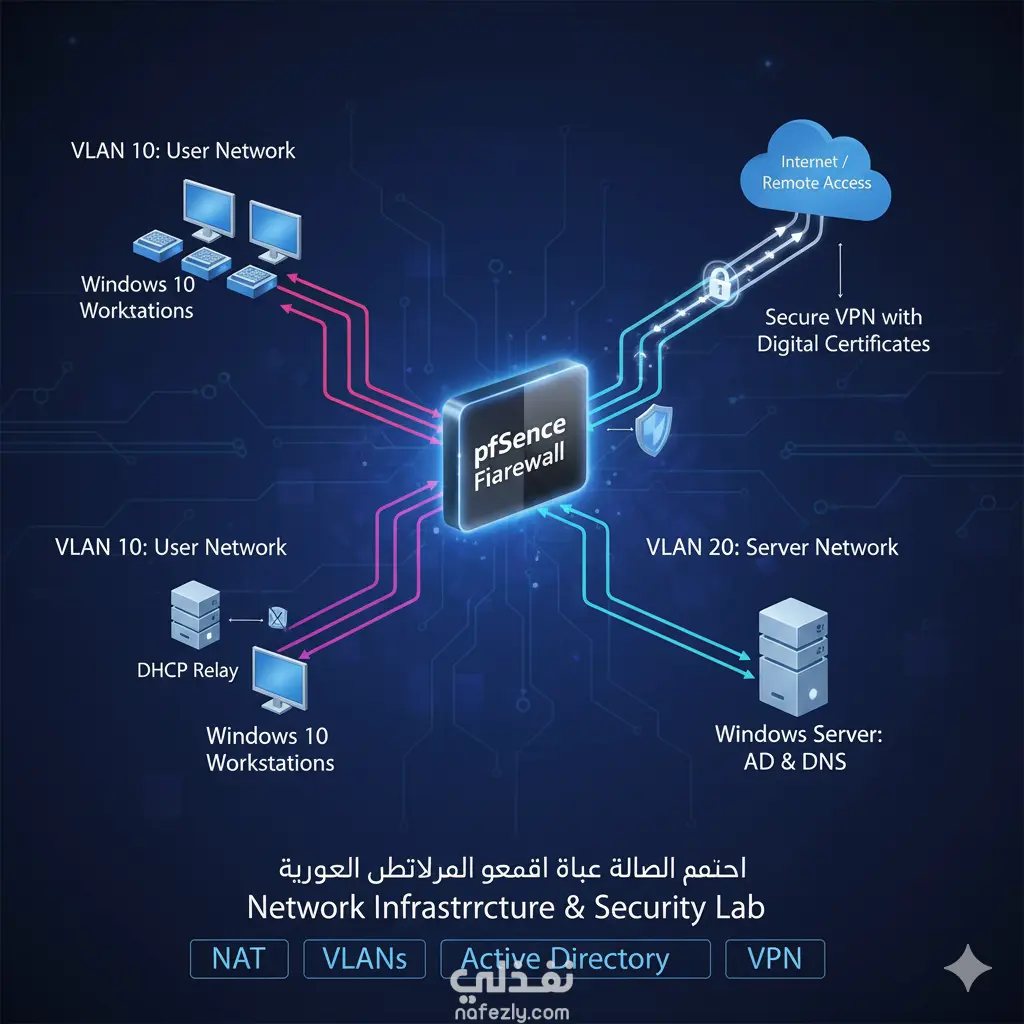 تم بناء معمل شبكات مؤسسي متكامل باستخدام pfSense وWindows Server وWindows 10. تم تكوين الجدار الناري، وNAT، وVLANs، وDHCP relay، وDNS، وActive Directory. كما تم إعداد اتصال VPN آمن باستخدام شهادات رقمية