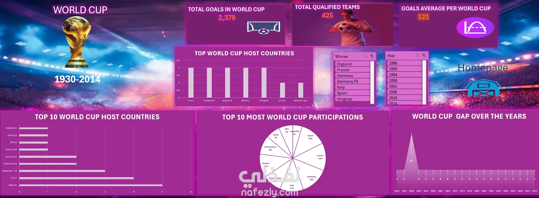 قمت بإنشاء لوحة تحكم تفاعلية لتحليل بيانات كأس العالم في الفترة 1930 – 2014. اللوحة تعرض إحصائيات مثل: